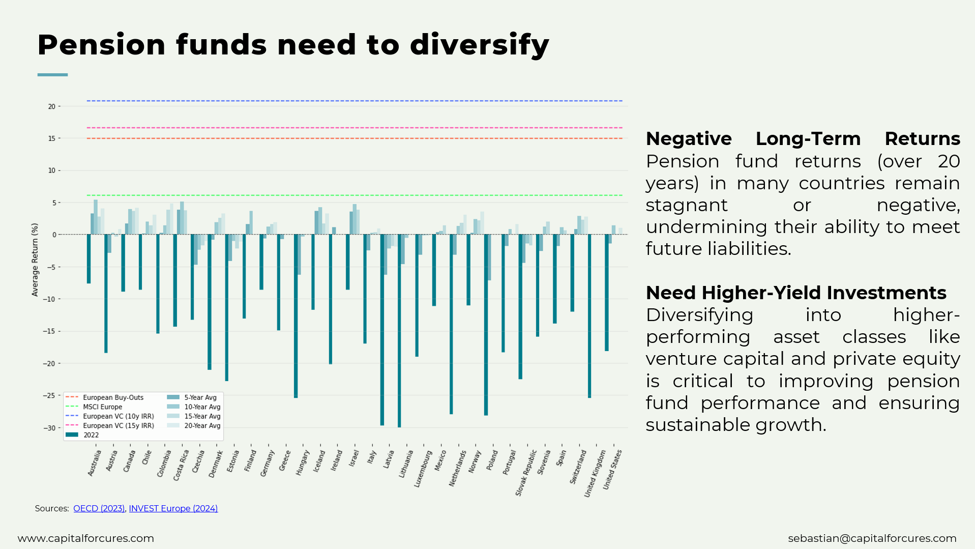 European pension funds are part of the problem. Compared to their North American counterparts, they have been exceptionally conservative, favoring government bonds and low-yield equities over higher-risk, higher-reward asset classes like venture capital and private equity. The result? Two decades of lackluster returns, putting pressure on pension systems already struggling with aging populations and growing liabilities.
