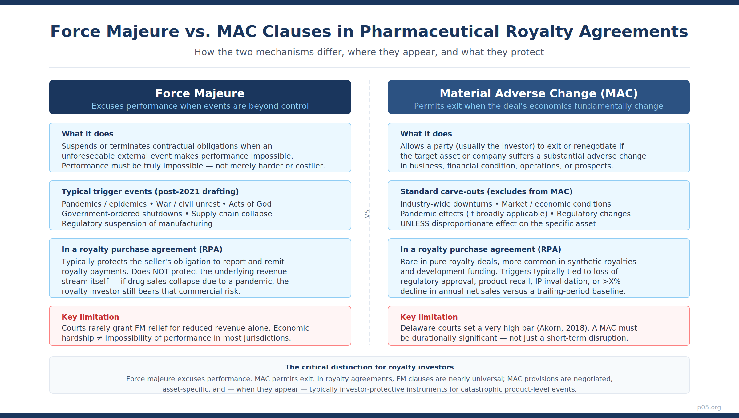 Force majeure and MAC provisions are present in pharmaceutical royalty agreements, and they matter — but not in the way most commentators assume when they raise the pandemic question. They do not protect royalty investors against pandemic-driven revenue declines. They protect the institutional infrastructure of the transaction: the obligation to report, remit, and maintain the legal basis for the royalty itself.