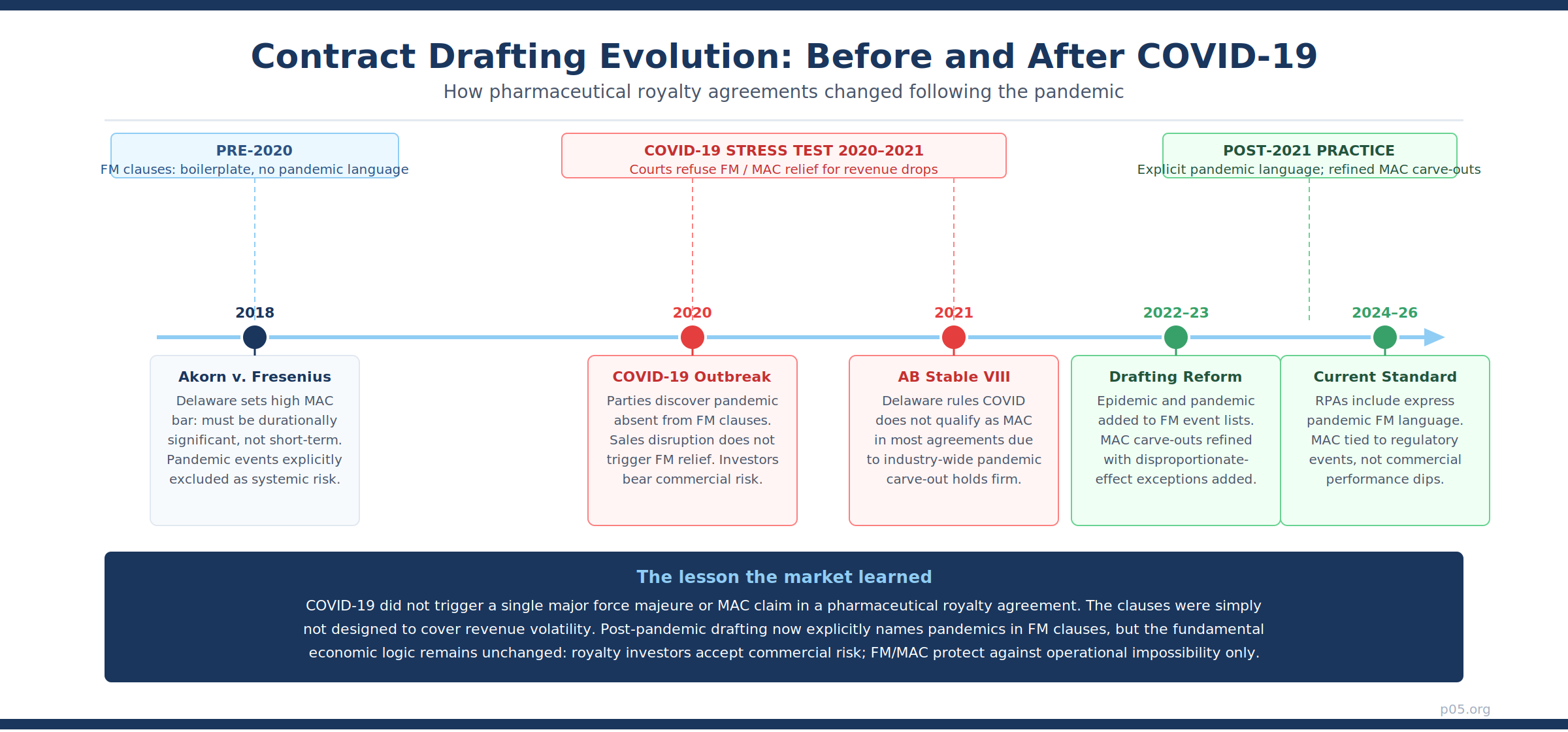 Five years on, the pharmaceutical royalty market has processed the implications of that discovery. This article examines whether force majeure and MAC provisions are present in royalty agreements, what function they actually serve, what could plausibly happen if the next pandemic or systemic shock materialises, and why the realistic answer is considerably less dramatic than the theoretical one.