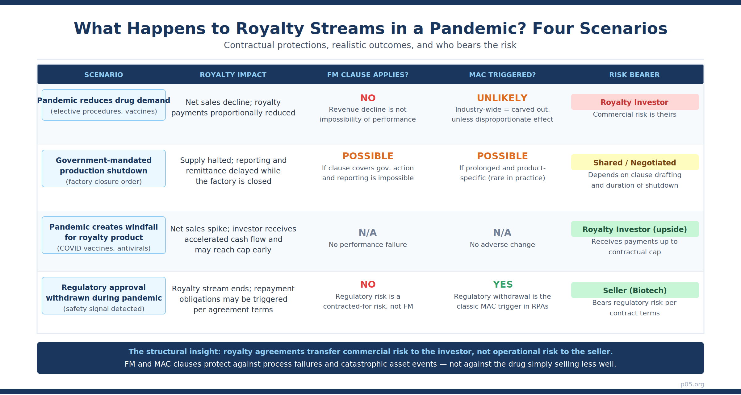 COVID-19 demonstrated that the commercial risk of a pharmaceutical royalty — the risk that a product sells more or less than projected — sits entirely with the investor. No FM or MAC clause was designed to, or did, transfer that risk back to the seller.