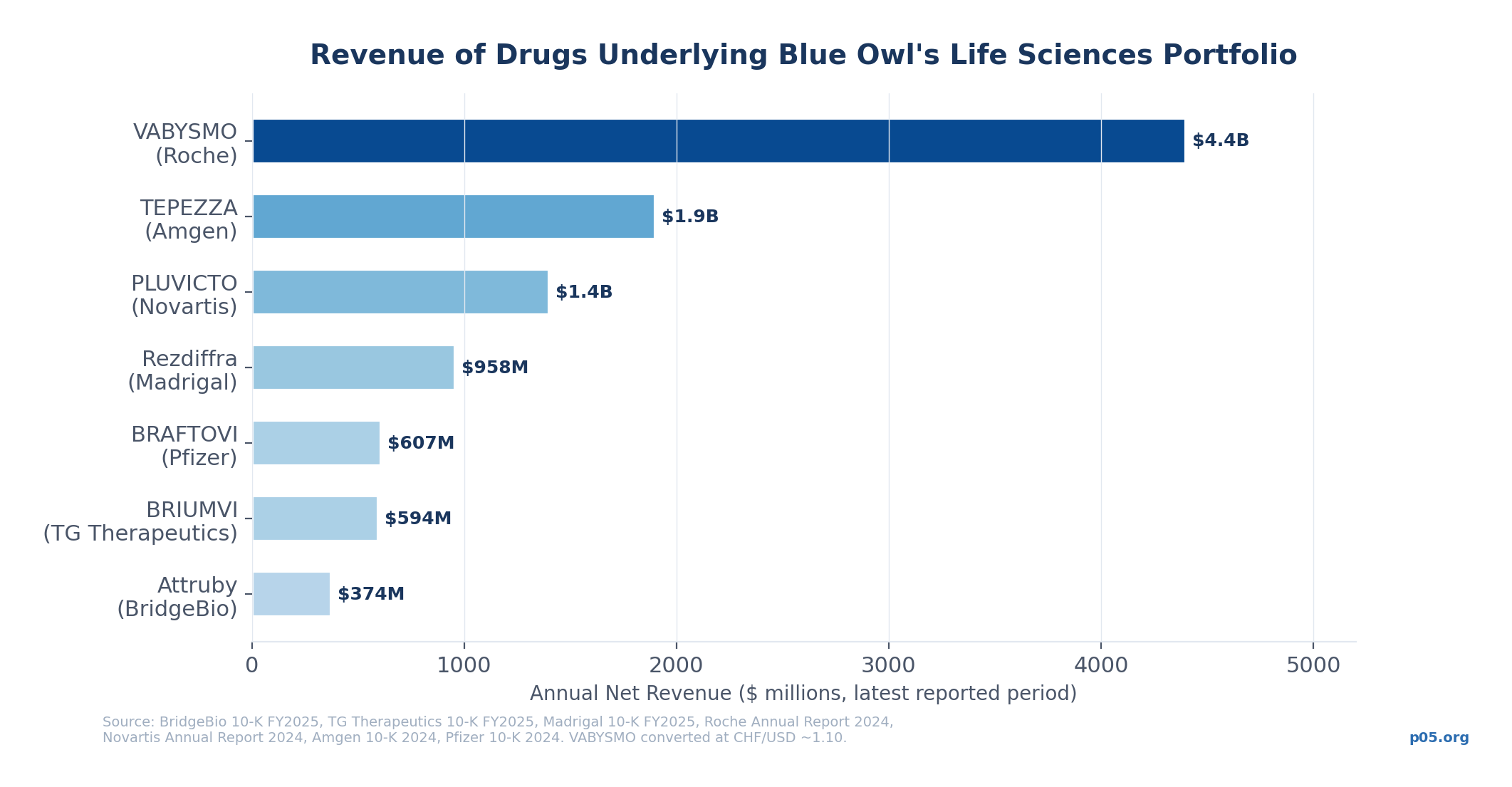 Counterparty perception. Biotech companies choosing royalty financing partners consider long-term platform stability. If the Blue Owl brand becomes associated with corporate distress, potential counterparties may weigh alternatives such as Royalty Pharma ($20.7B market cap), KKR-backed HCRx, or DRI Healthcare. The royalty market is relationship-driven.