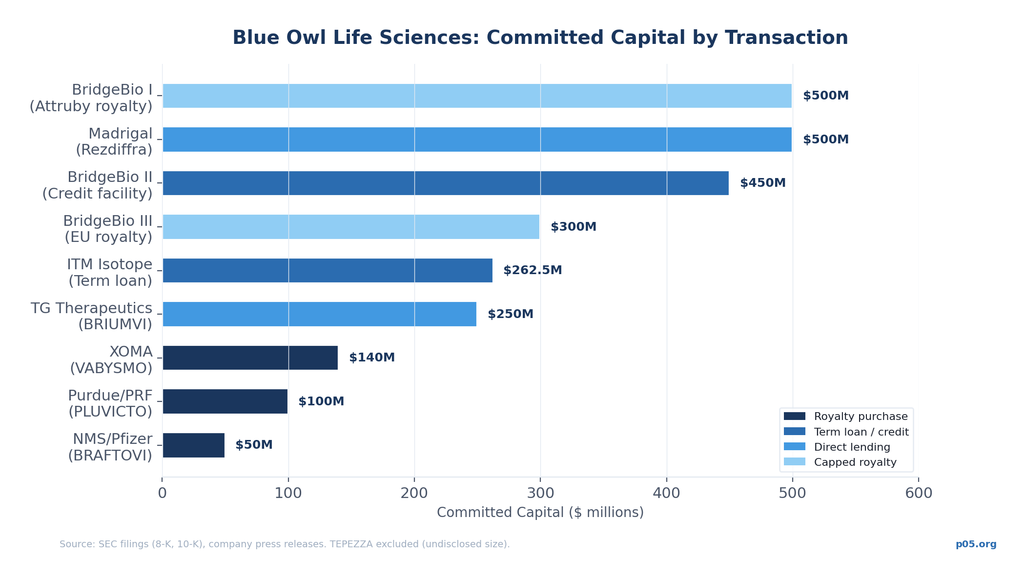 Blue Owl's life sciences platform has assembled a portfolio across nine disclosed transactions, using three distinct structural approaches: outright royalty purchases, royalty-backed lending, and senior secured direct lending to commercial-stage biopharma.