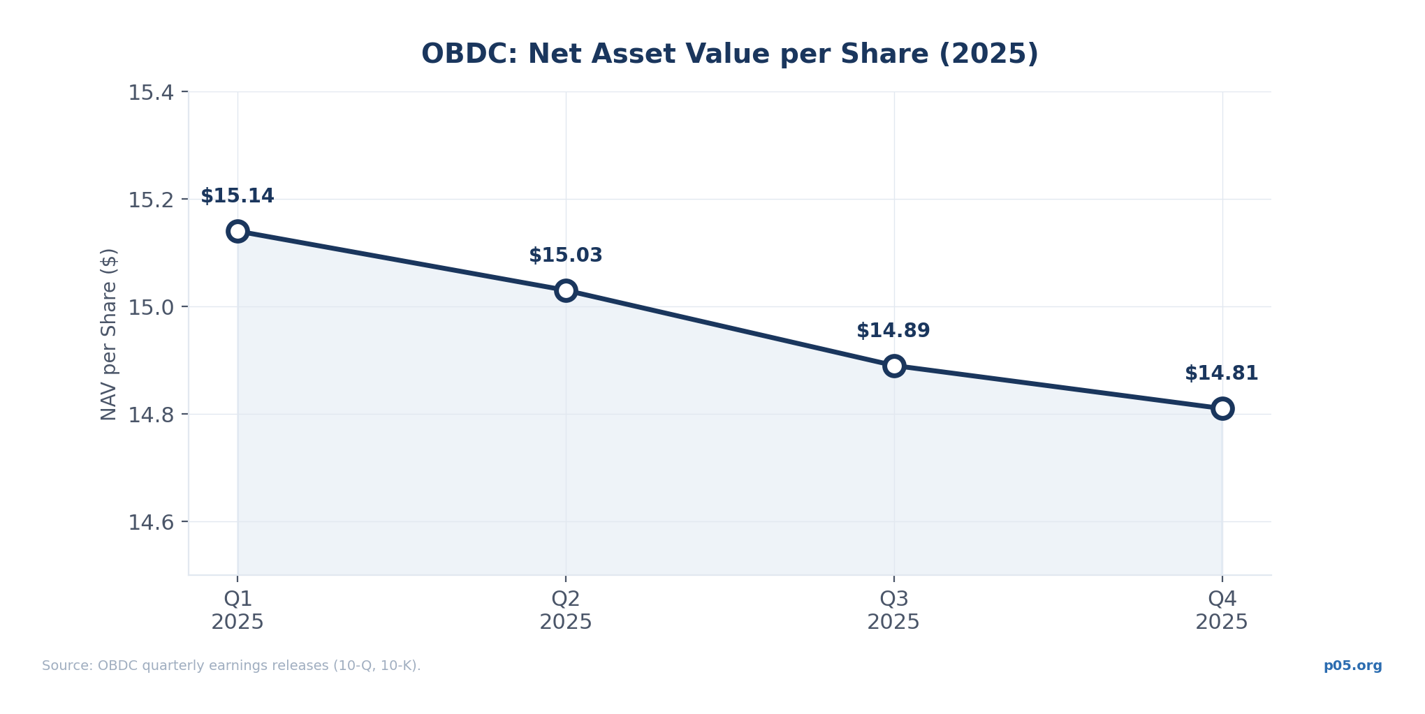 Equity and leverage. OBDC operated at 1.19× net debt-to-equity as of Q4 2025, within its stated target range of 0.9×–1.25×. OCIC maintained 0.80×. Maximum regulatory leverage for standard BDCs is 2.0×; OBDC II operates under a 1.0× cap.
