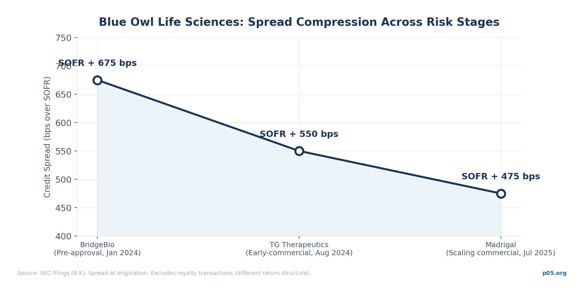 The spread compression across the portfolio reflects this risk graduation: SOFR + 675 bps (pre-approval BridgeBio) → SOFR + 550 bps (early-commercial TG) → SOFR + 475 bps (rapidly scaling Madrigal). Blue Owl prices risk on a drug's revenue trajectory, not biotech sector sentiment.