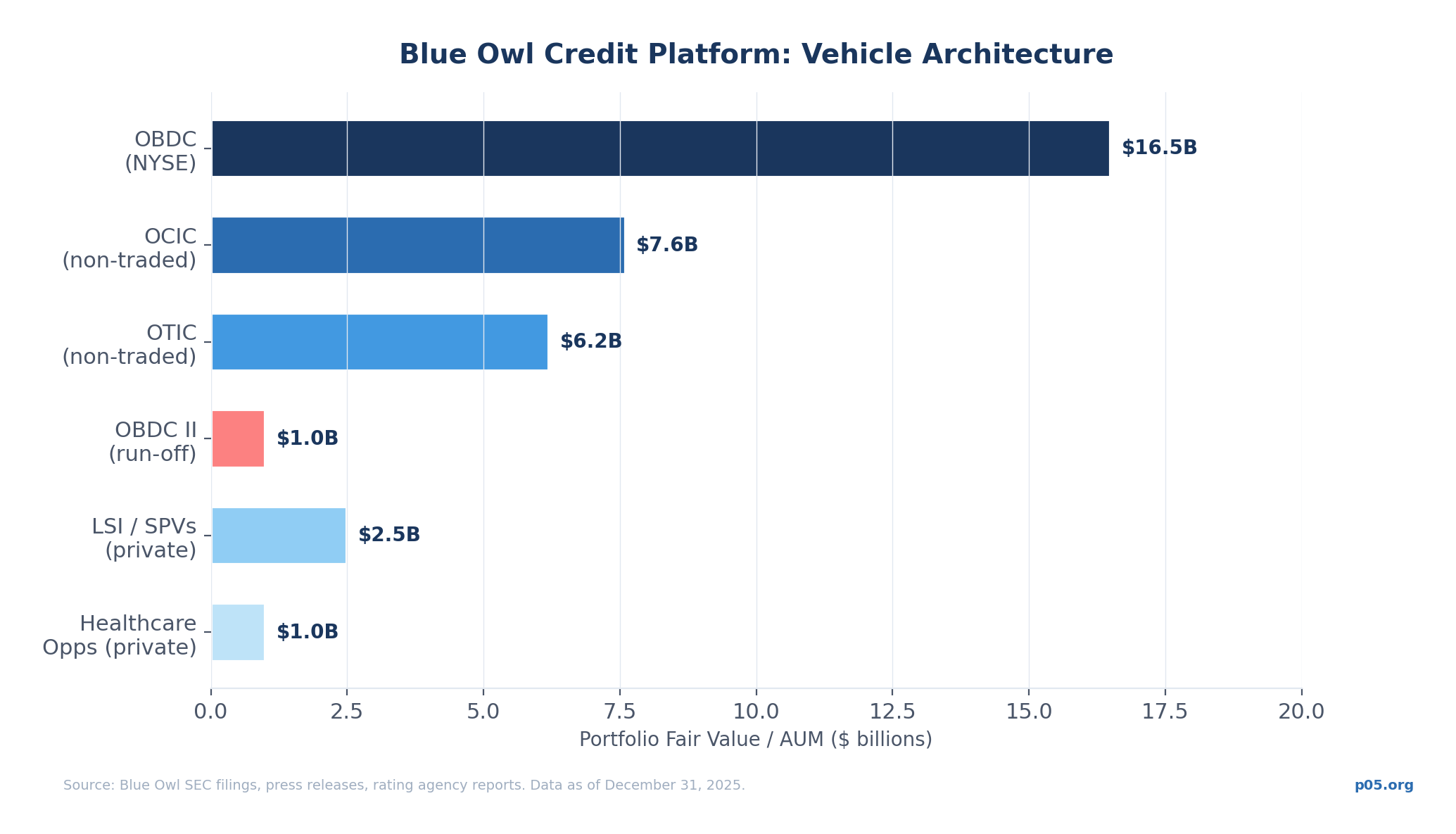 Blue Owl runs its credit business through six BDCs and one interval fund, each designed for a different investor channel and strategy. The key vehicles are: