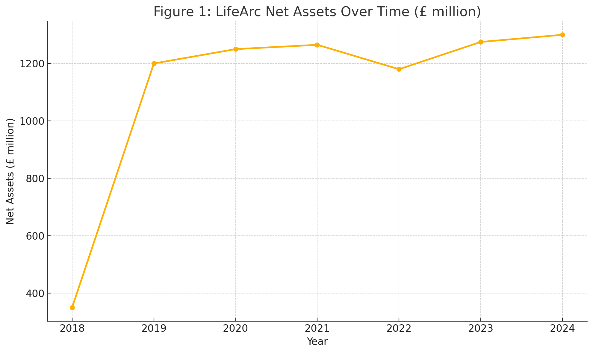 Figure 1: LifeArc net assets (funds) at year-end. A major one-time royalty sale in 2019 boosted assets to ~£1.2 billion. Since then, prudent investment returns and spending led to modest growth, with a dip in 2022 (market downturn) and a rebound in 2023 (royalty income + market gains).