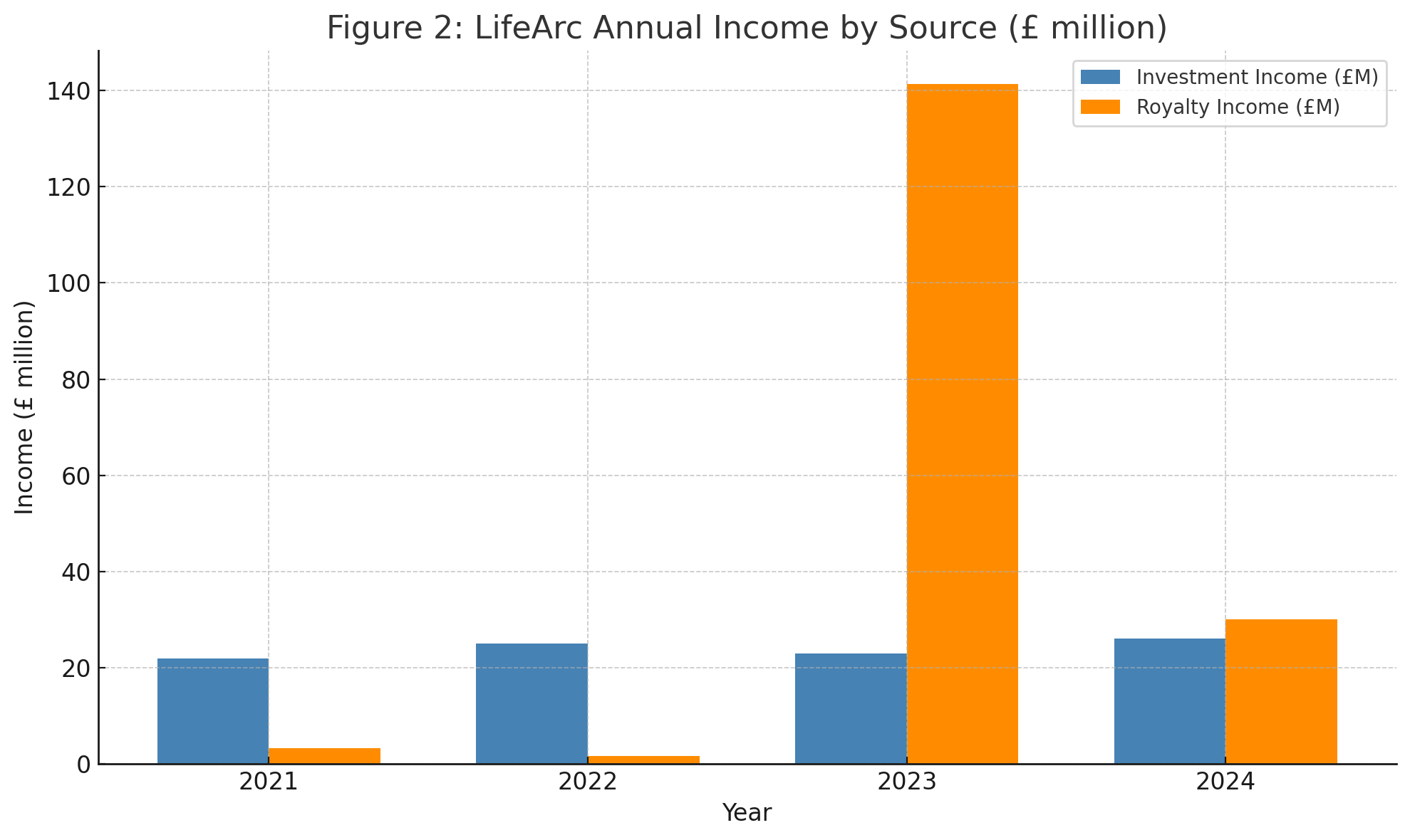 Figure 2: LifeArc annual income by source. Investment income (blue) has been steady, reflecting returns on the £1.2–1.3B portfolio. By contrast, royalty and contract income (orange) was minimal (~£2–3M) in 2021–2022, then spiked above £140M in 2023 due to a major royalty monetization or license deal.