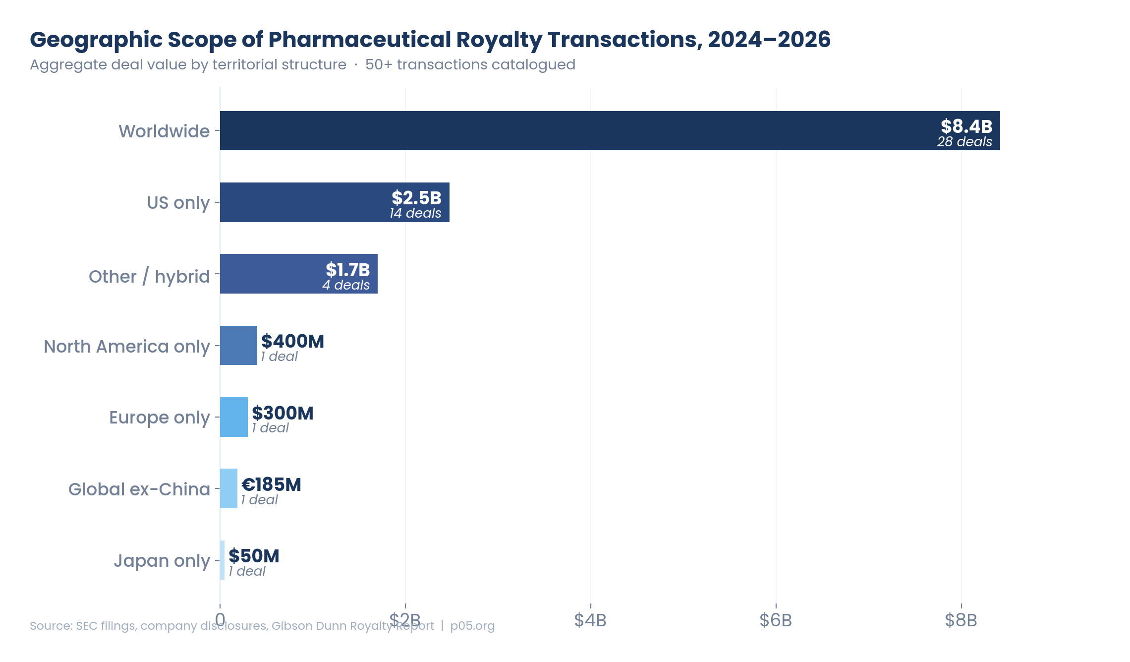 Regional deals are no longer anomalies. The emergence of Europe-only, North America–only, and Japan-only transactions as distinct categories — even if each currently contains only one or two deals — represents a structural shift. These transactions demonstrate that specific territories can support institutional-scale financing on a standalone basis. Moreover, the implied global-ex-China scope in the Blackstone/Merck sac-TMT deal suggests that this geographic structure will become increasingly common as China-originated assets advance through Western clinical development.