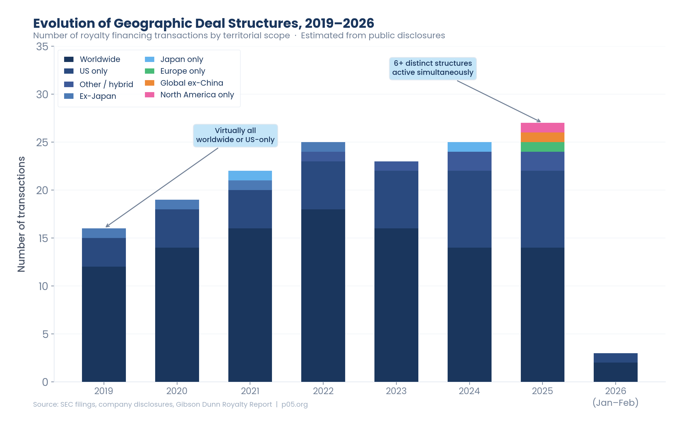 The chart above illustrates the proliferation of geographic structures over time. In 2019, virtually all deals fell into two categories: worldwide or US-only, with occasional ex-Japan or Japan-only outliers. By 2025, the market had fragmented into six or more distinct structures operating simultaneously.