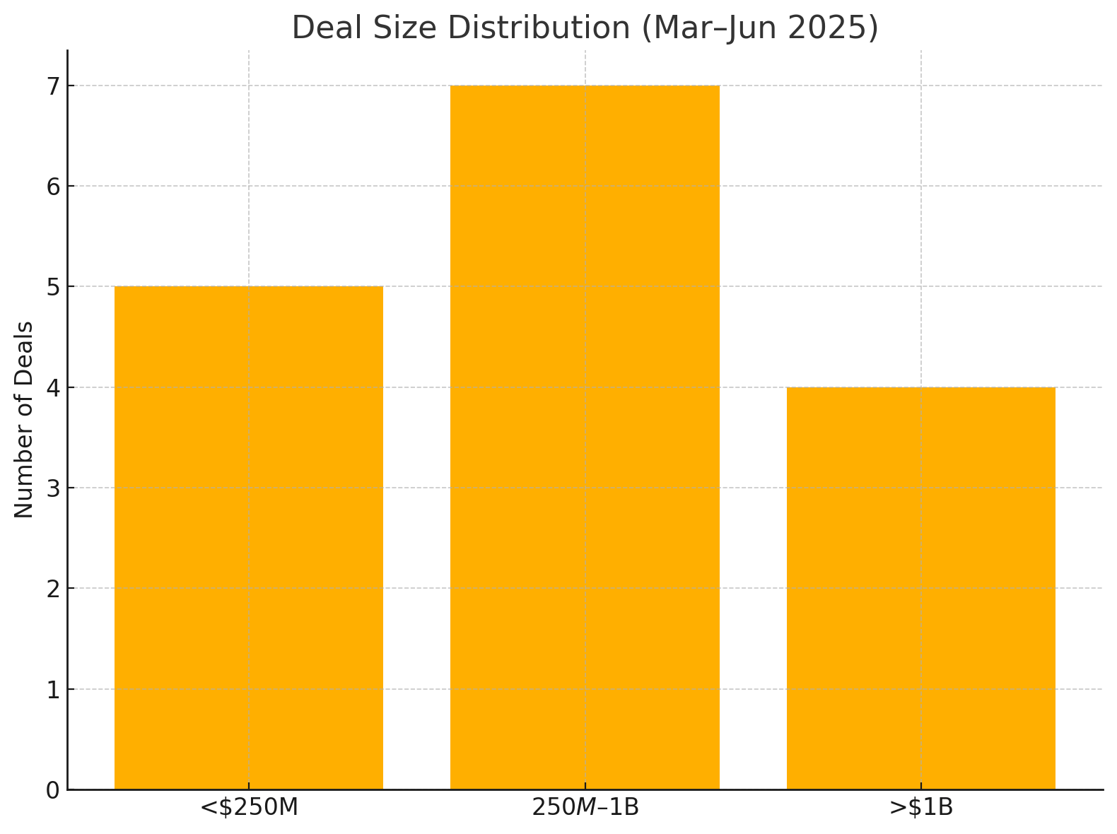 Figure: Distribution of Deal Counts by Size Category per Month (Mar–Jun 2025). Each column is a month, divided into segments representing deals valued at >$1B (large), $250M–$1B (mid-sized), and <$250M (small/startup deals). March saw the most large deals (3) and mid-sized deals (2). April had one large and one mid-sized. May saw one large and multiple mid-sized and small deals. June (through late June) featured one very large deal (Sanofi–Blueprint) but fewer total deals.