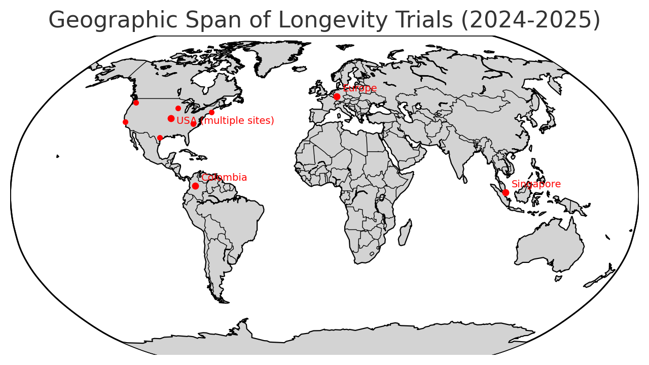 Figure 1: Global locations of major longevity trials in 2024–2025. Red dots indicate trial sites (USA has multiple clusters; EU planned sites; trial in Singapore; a paid gene therapy in Colombia) based on sourcesafar.orgclinicaltrialsarena.com.