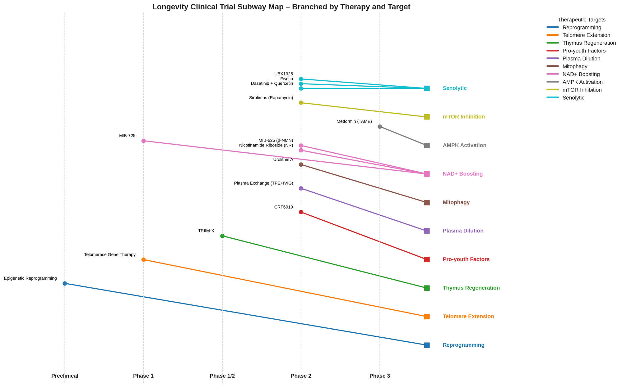 Figure 2: Frequency of therapies by target mechanism in current human trials. Senolytic and NAD-boosting approaches dominate, followed by metabolic modulators, plasma-based therapies, etc., as derived from the list below.