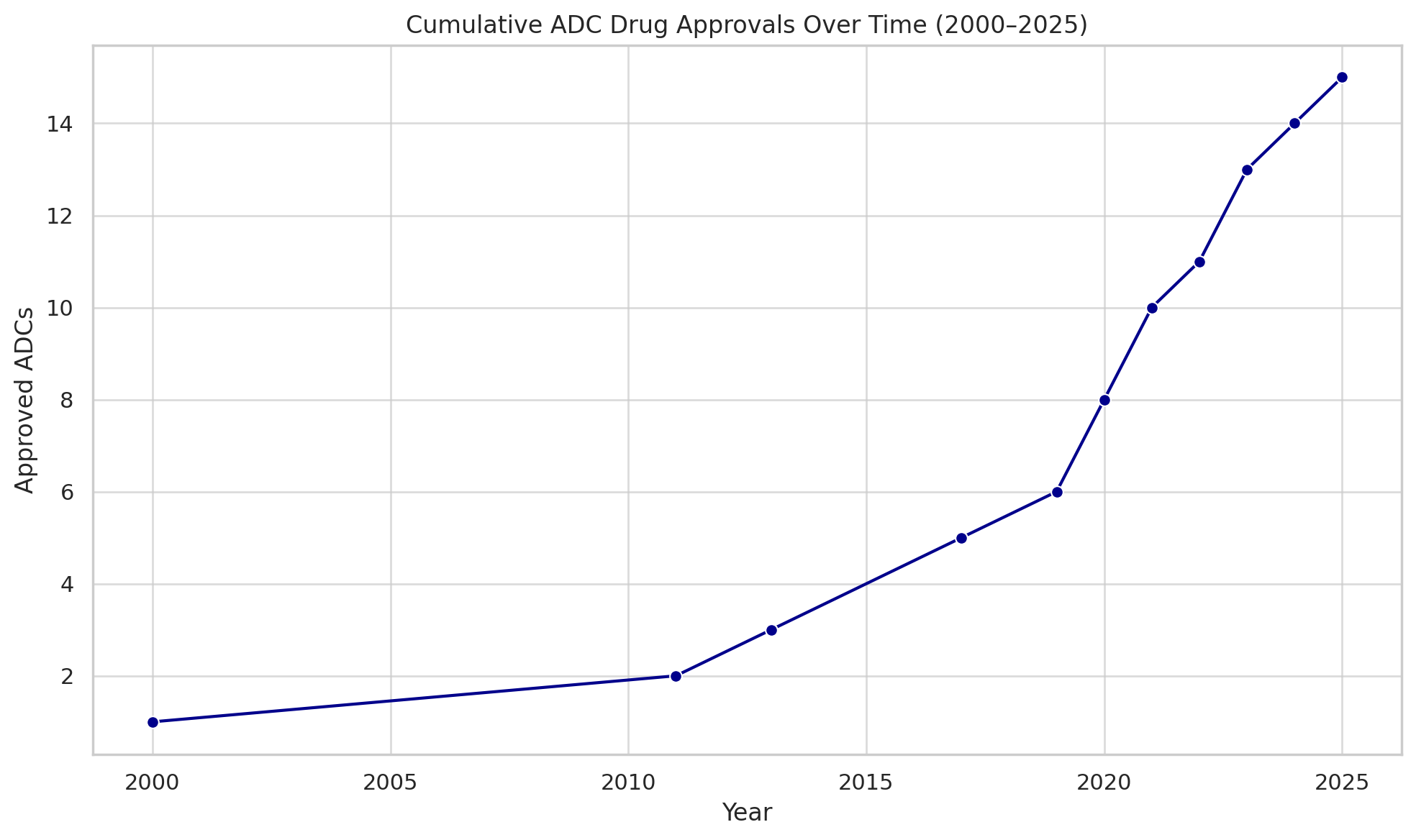 Cumulative number of ADC drugs approved globally (FDA and other agencies). After a lone pioneer in 2000, approvals picked up notably from 2019 onwards, reaching 15 by mid-2025. (dcatvci.org)