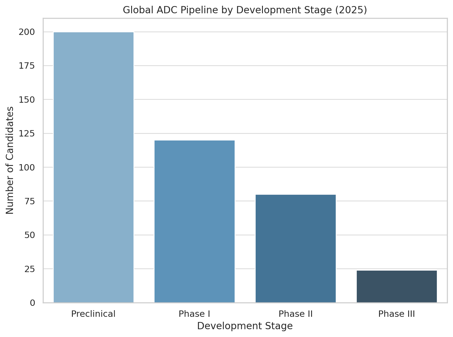 Behind the dozen-plus ADCs already saving patients lies a vast pipeline of next-generation conjugates. ADC development has well and truly gone global. By 2025 there were over 400 ADCs in development worldwide, with more than 200 of those already in clinical trials (the remainder in preclinical stages). Dozens of new ADC candidates enter Phase I testing each year as biotechnology startups and pharma companies large and small pile into the field. The chart below breaks down this burgeoning pipeline by development phase: