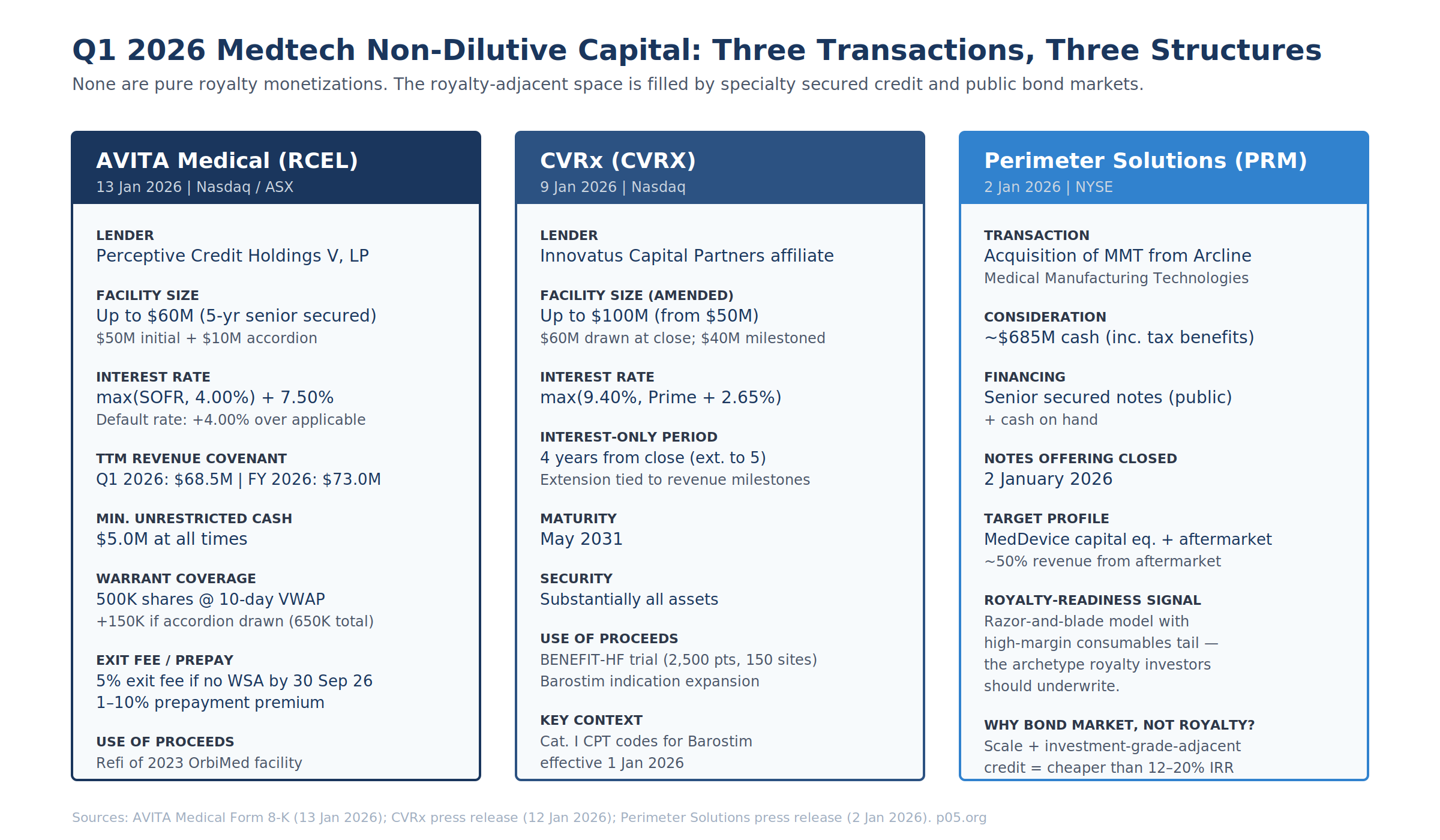 Pure medical device royalty monetization remains a small segment of the life sciences non-dilutive capital market. Of Gibson Dunn's reported $6.5 billion in aggregate 2025 royalty financing, the device share is statistically rounding error — and Q1 2026 continued the pattern. Three transactions closed in January 2026 that should be read as the working template for commercial-stage medtech non-dilutive capital: AVITA Medical's Perceptive-led refinancing, CVRx's Innovatus term loan amendment, and the Perimeter Solutions / MMT senior-secured-notes-financed acquisition. None is a synthetic royalty.
