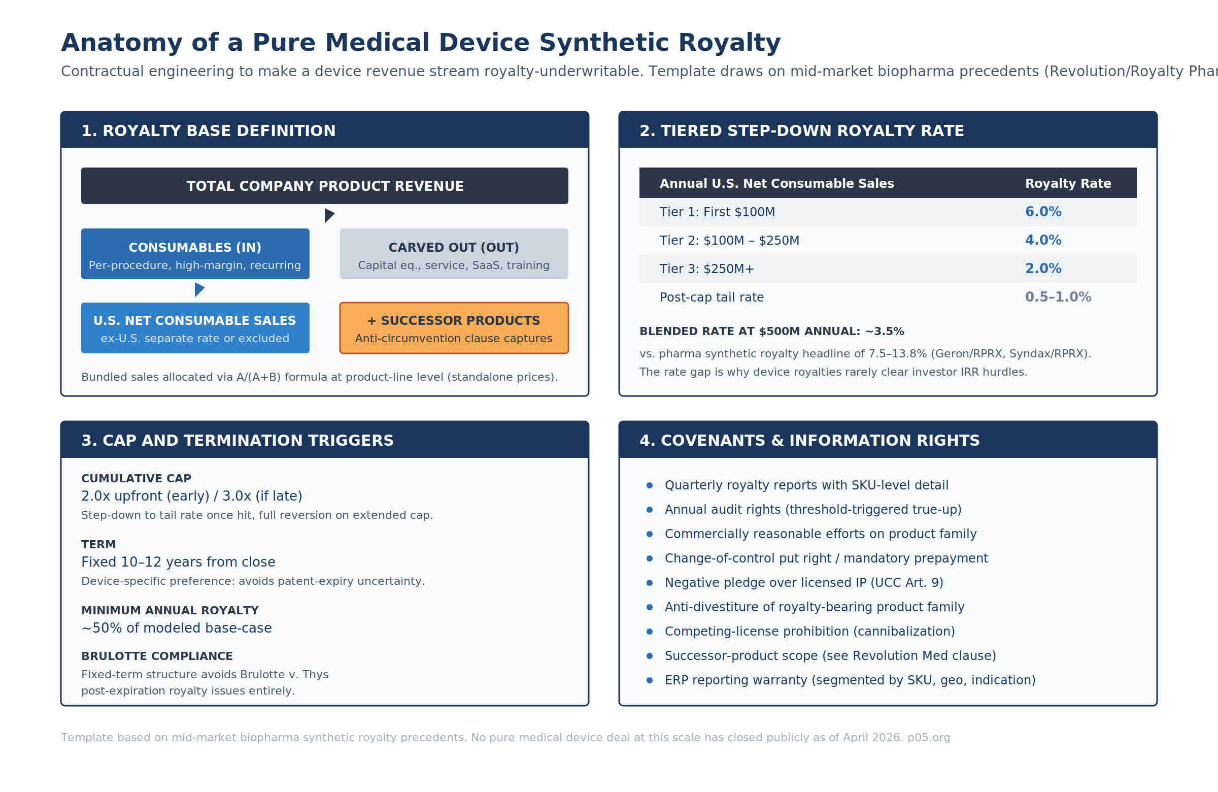 The underlying math problem is well-known: a flat synthetic royalty at biopharma-market rates of 7.5–13.8% damages device unit economics on a 50–75% gross margin base. A synthetic royalty at medtech-license-market rates of 4–6% does not clear a royalty fund's 12–20% IRR hurdle against device-specific underwriting risks. Tiered step-downs close part of the gap; the rest must come from tight cap structuring and structural protections.
