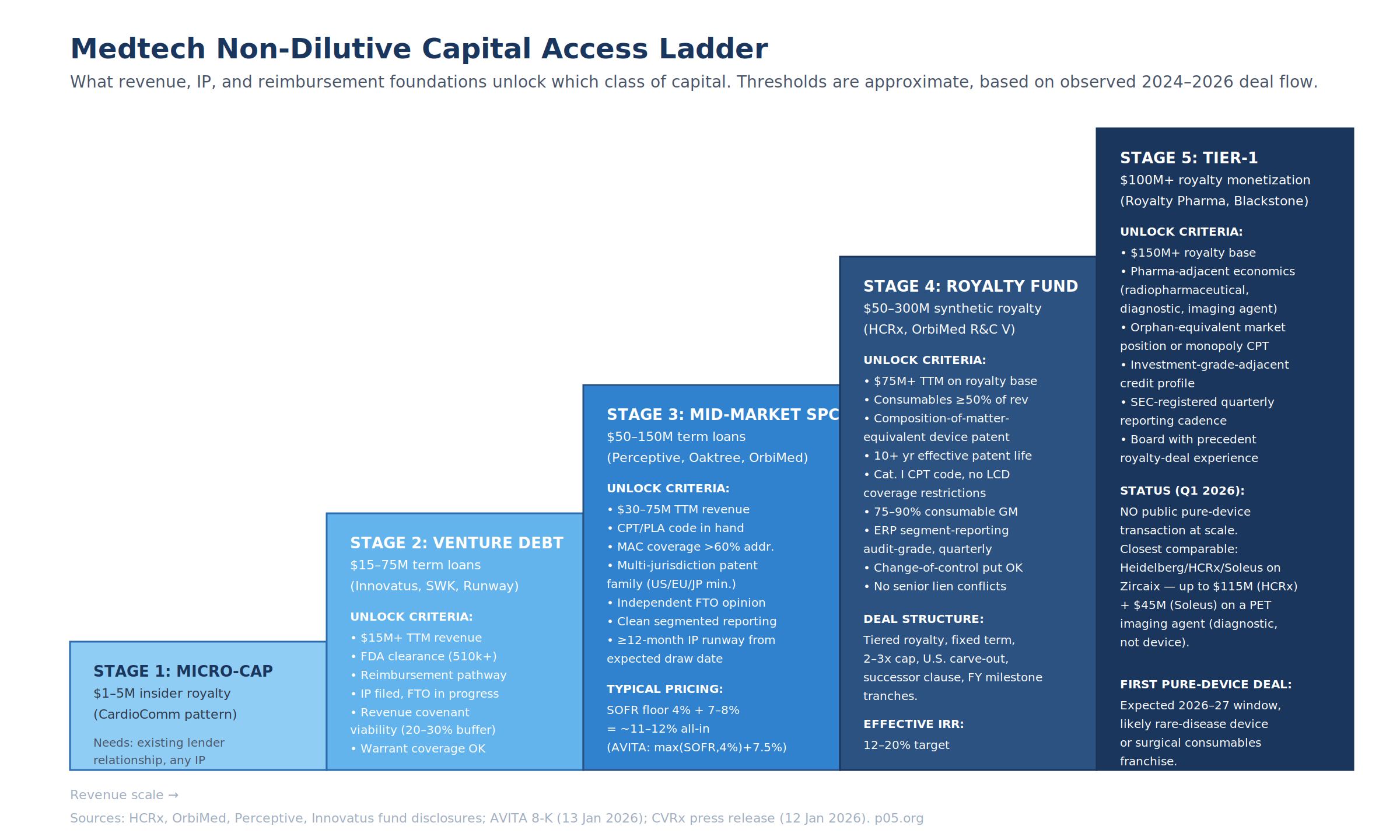 The ladder above maps observable 2024–2026 deal thresholds to five capital tiers. The gating criteria are a working synthesis of fund disclosures (HCRx, OrbiMed, Perceptive, Innovatus), AVITA and CVRx 8-K covenant structures, and comparable biopharma royalty deal terms.