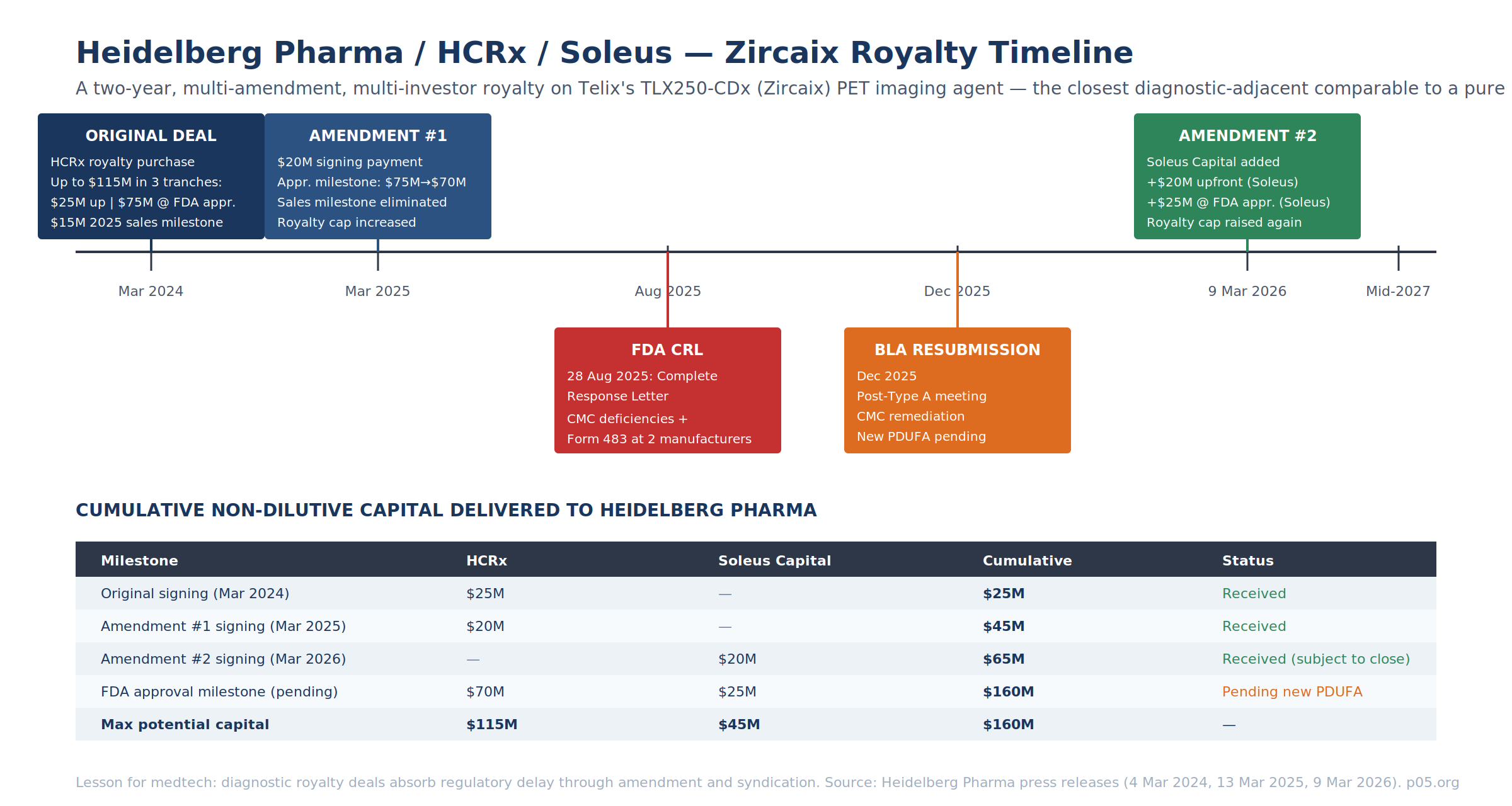 The 9 March 2026 Heidelberg Pharma press release announced a second amendment to the March 2024 royalty purchase agreement with HCRx on Telix Pharmaceuticals' TLX250-CDx (Zircaix, 89Zr-DFO-girentuximab) — a PET imaging agent for clear cell renal cell carcinoma. The amendment brings Soleus Capital Management in as a second royalty investor via its Soleus Capital Credit Opportunities Fund I.
