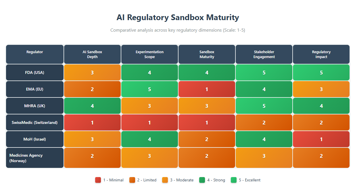 Each of the six regulators is leveraging the sandbox concept in a manner tailored to its jurisdiction: the FDA and MHRA operationalizing innovation within current authorities, the EMA and Israel building new formal frameworks to enable breakthroughs, Norway incrementally expanding cross-sector guidance toward experimental flexibility, and Switzerland focusing internally while eyeing future competitive advantages.