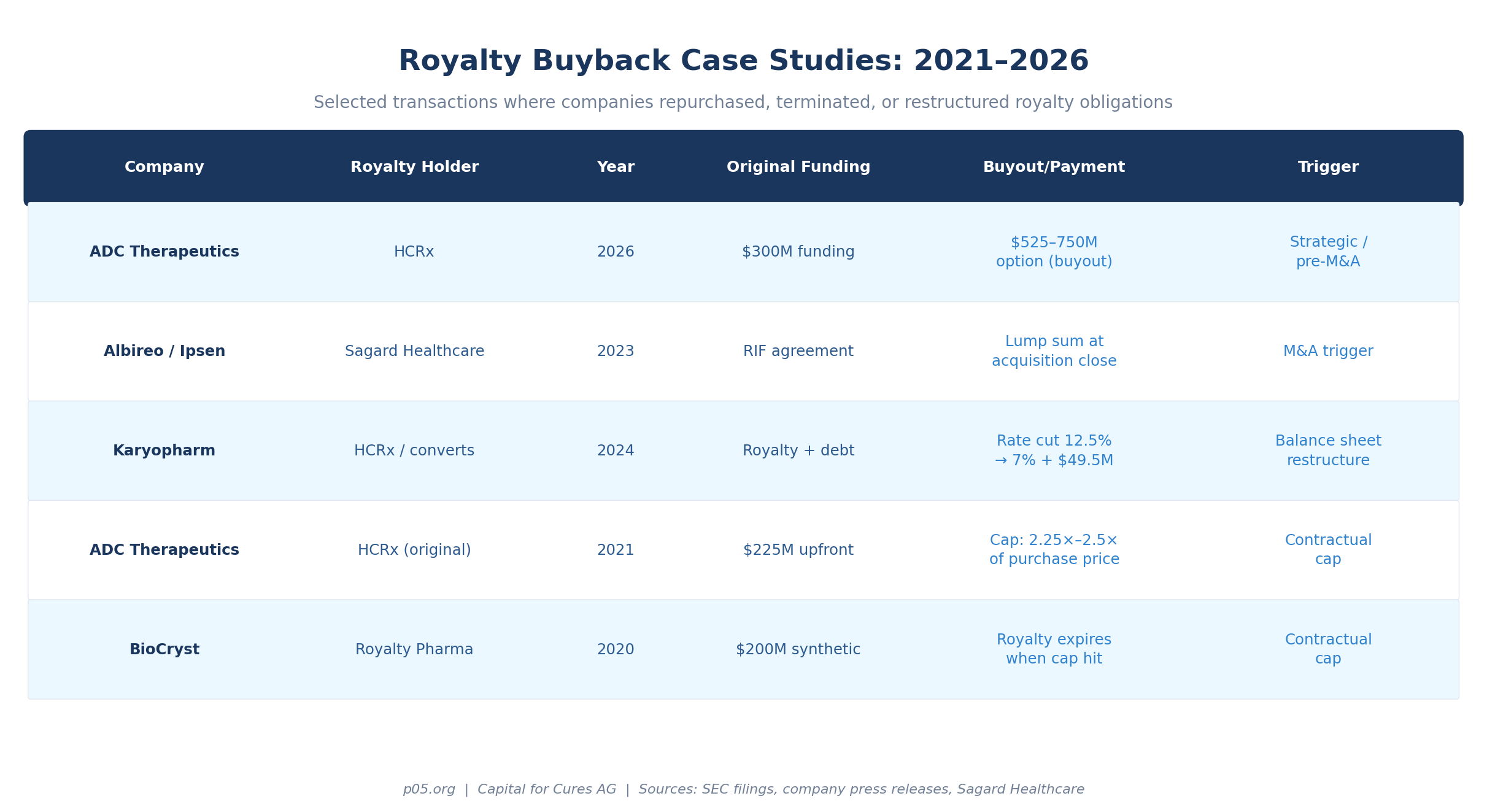 This article examines the anatomy of pharmaceutical royalty buybacks: the contractual mechanisms that make them possible, the strategic logic that makes them rational, the market conditions that make them likely, and the examples from 2021 to 2026 that illustrate how they actually unfold. The answer to whether royalty buybacks "happen" is yes, but the frequency, form, and motivation vary significantly by context.