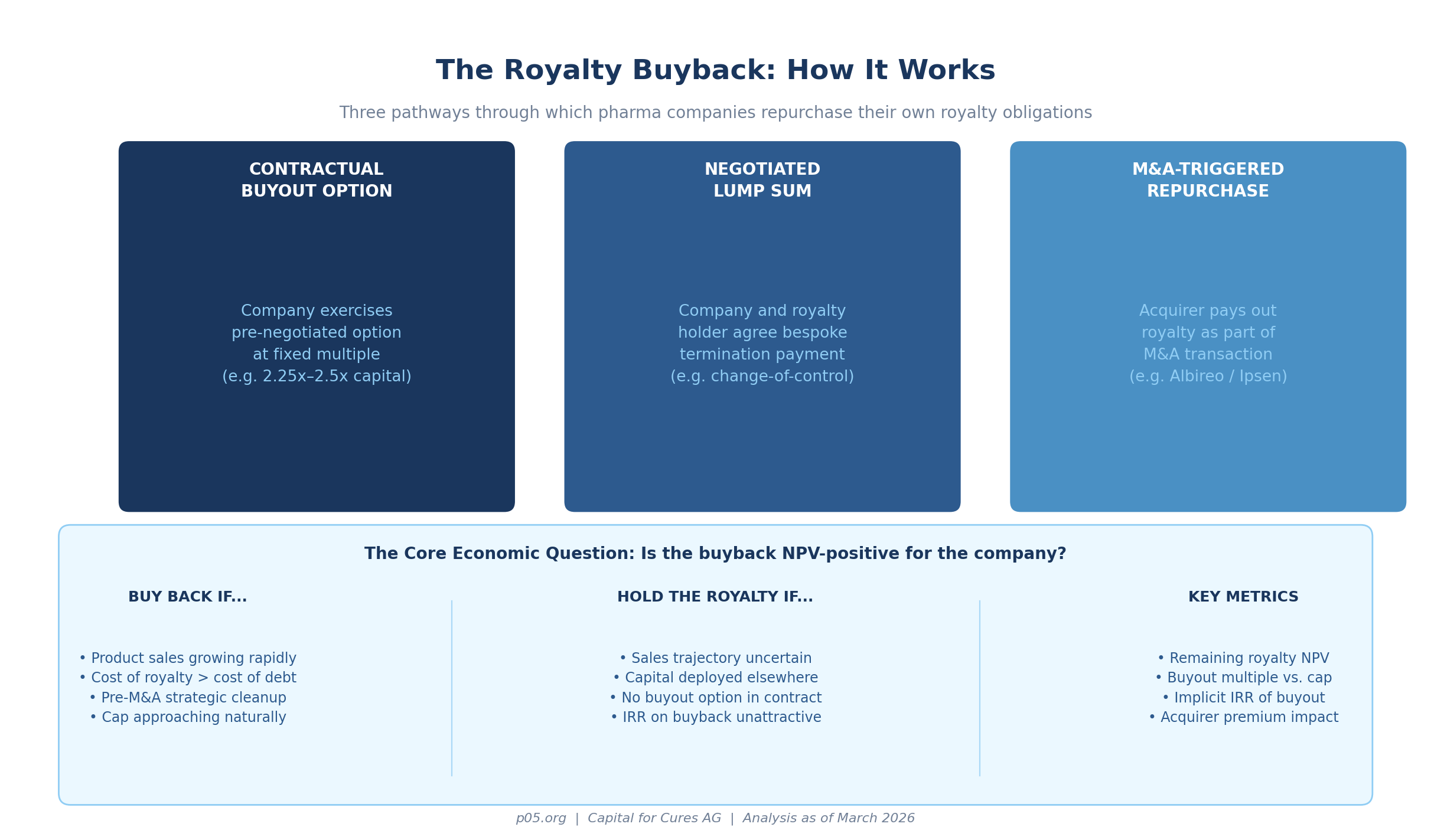 Royalty buybacks are real, they are rational, and they are underappreciated as a strategic tool in pharmaceutical capital allocation. They happen in three distinct ways: automatically through cap attainment, actively through exercise of pre-negotiated buyout options, and transactionally through M&A-triggered termination payments. Of these, cap attainment is the most frequent, active buyout exercise is the rarest, and M&A-triggered termination is the most economically significant.