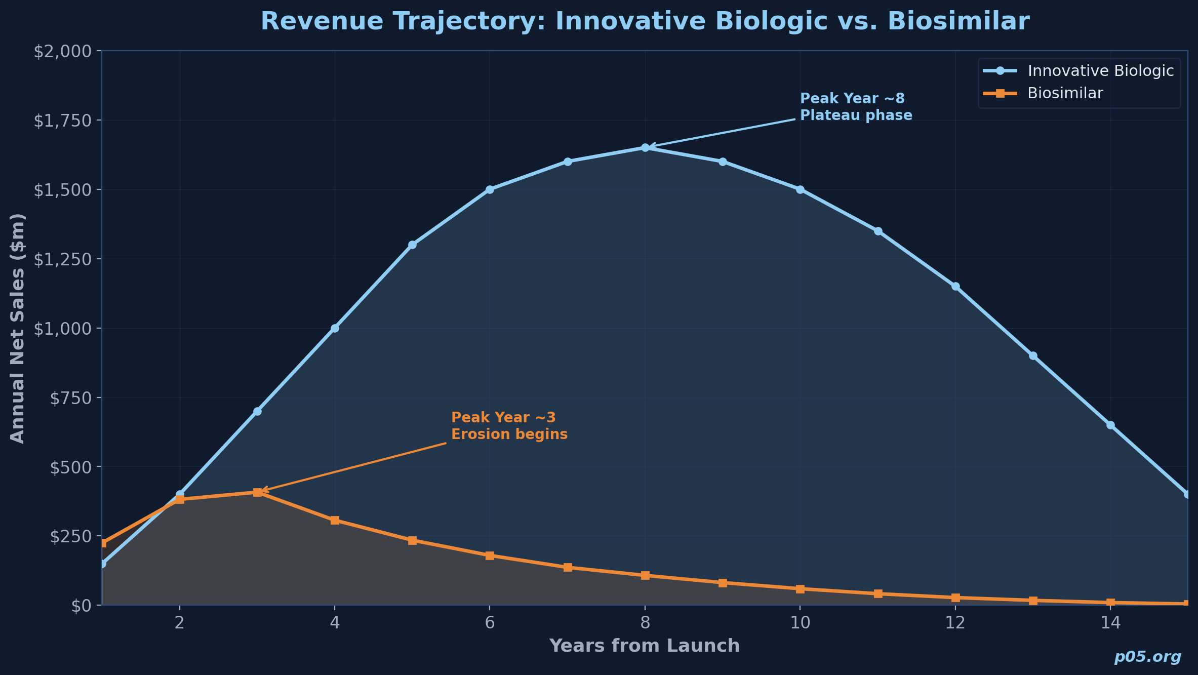 The central modelling challenge is the revenue trajectory. For innovative biologics, the standard approach is to project peak sales, estimate years to peak, and model a post-peak decline driven by patent expiry and loss of exclusivity. For biosimilars, the relevant model is an S-curve of market penetration against a declining price base.