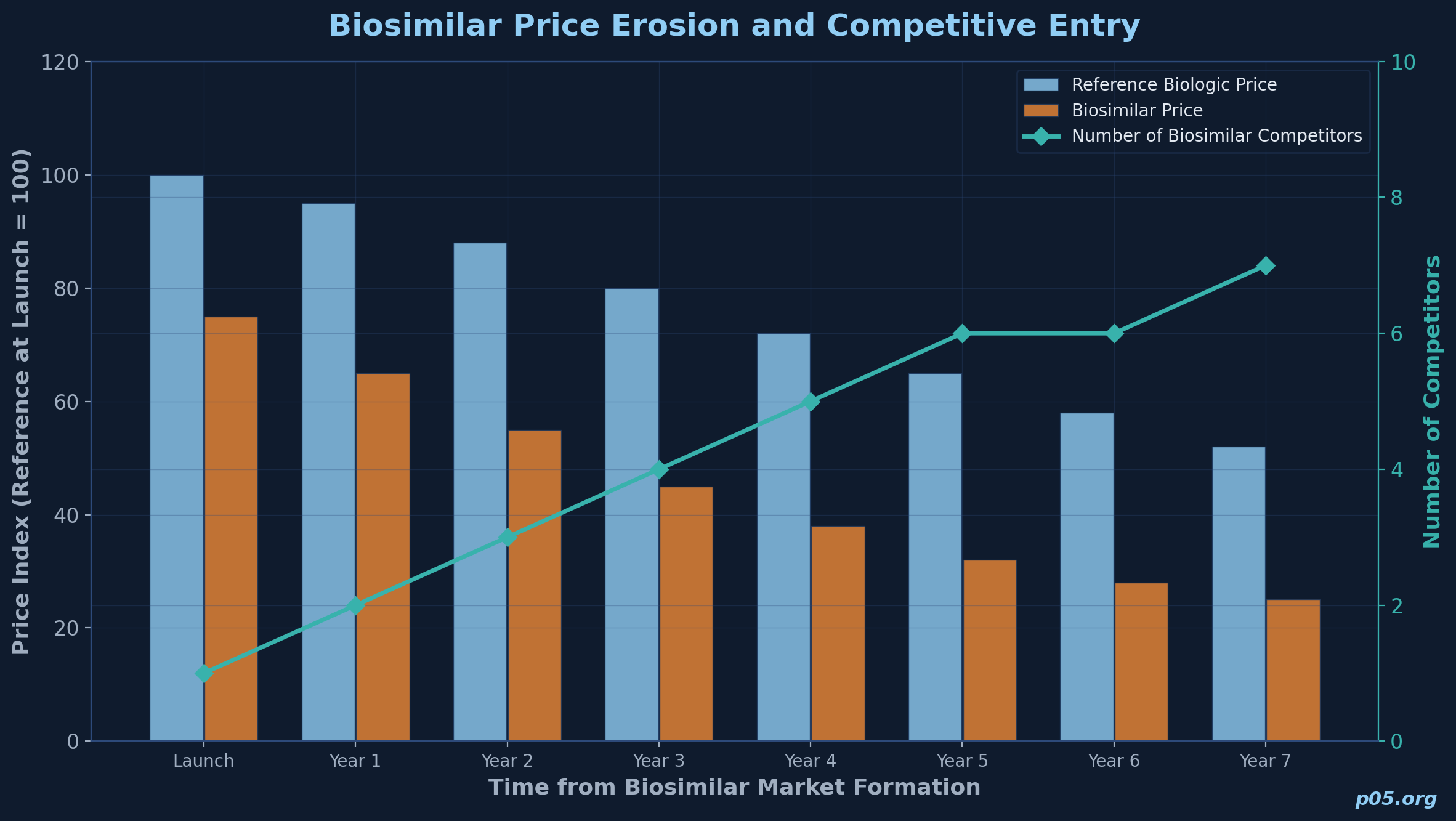A simplified illustrative projection for a biosimilar entering a $5 billion reference market might look as follows: