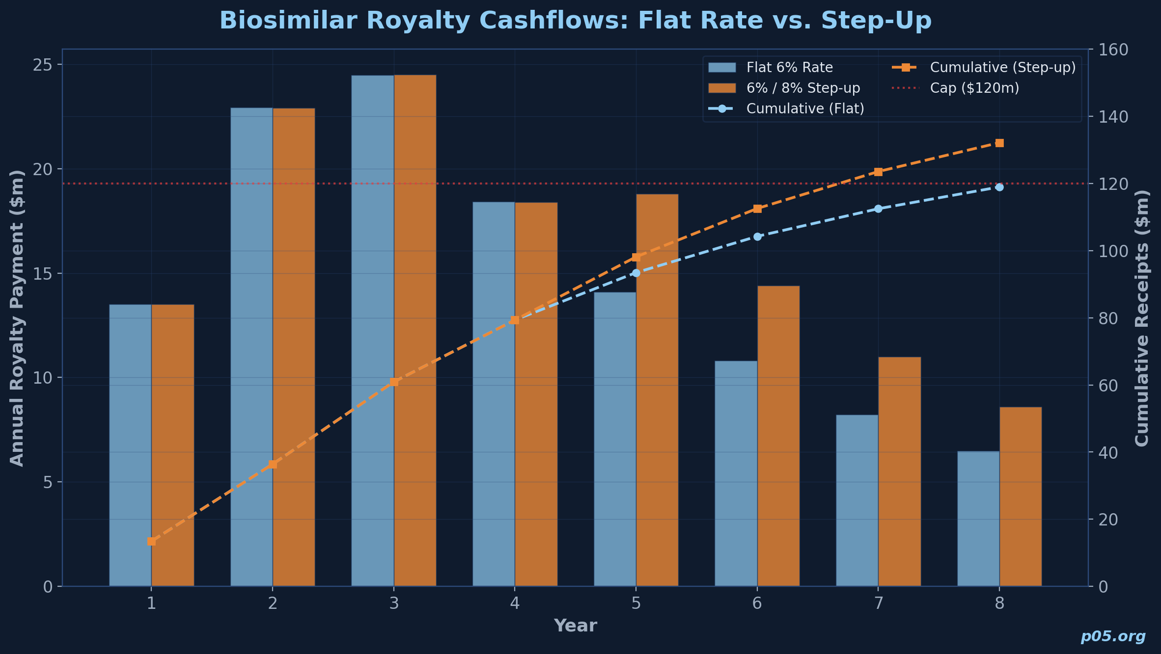 The hard cap is particularly important in biosimilar-linked structures because the declining revenue base may not support uncapped receipts over a long time horizon.