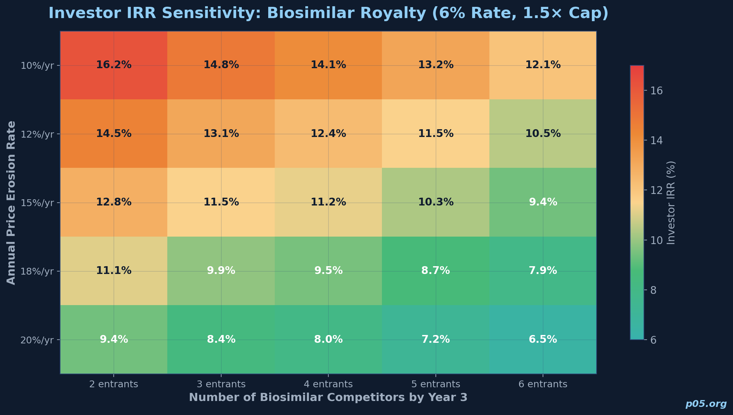 The key takeaway is that biosimilar royalty returns are highly sensitive to the rate of price erosion and the number of competitors. A two-percentage-point increase in annual price erosion can reduce the investor's IRR by nearly 300 basis points. This sensitivity is substantially greater than in innovative-asset royalty models, where the revenue base is more stable during the projection period.