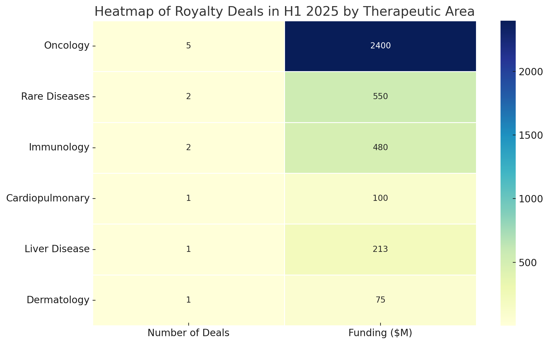 Heatmap of H1 2025 deals by therapeutic area and development stage. Darker cells indicate a higher count of deals in that category. Oncology assets accounted for the most deals overall, especially at the Phase 3 stage, while royalty financings for preclinical or Phase 1 programs were absent.