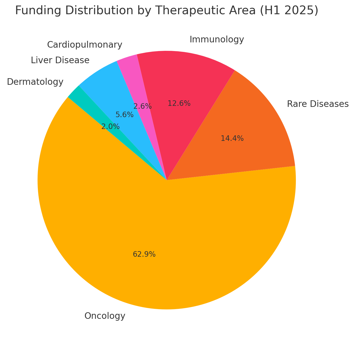 Therapeutic focus: The H1 2025 deals skewed toward the oncology space. By volume, approximately 70% of the total disclosed funding went into cancer-related assets – including a novel targeted therapy for pancreatic/lung tumors, a precision radiopharmaceutical diagnostic, and an established chemotherapy product.