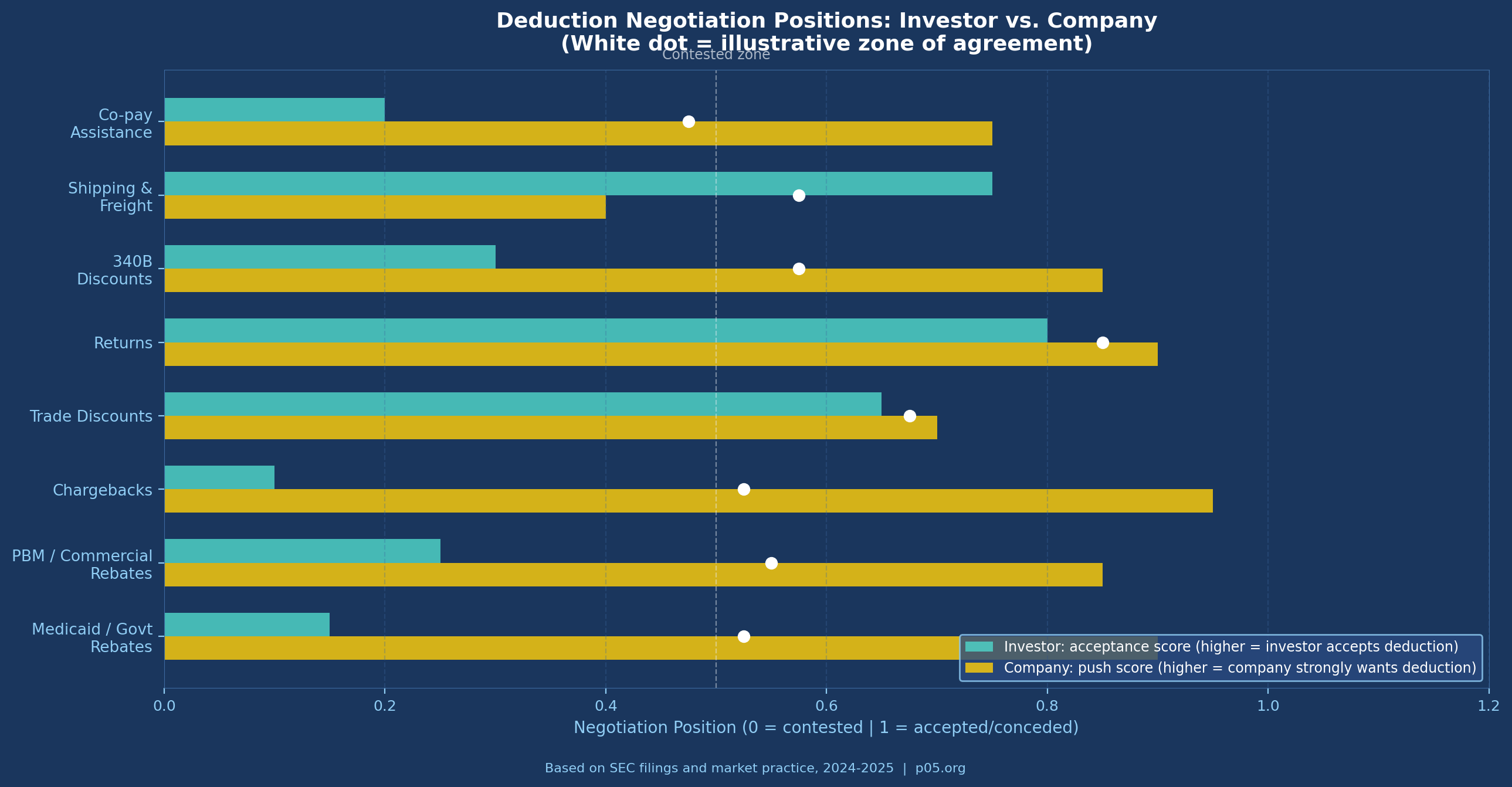 Deduction caps: Investors strongly prefer aggregate caps of 20–30% of gross sales. Companies prefer uncapped deductions, arguing that Medicaid and commercial rebate obligations are outside their control. The resolution typically lands at a cap of 25–35%, with carve-outs for extraordinary government pricing programmes.