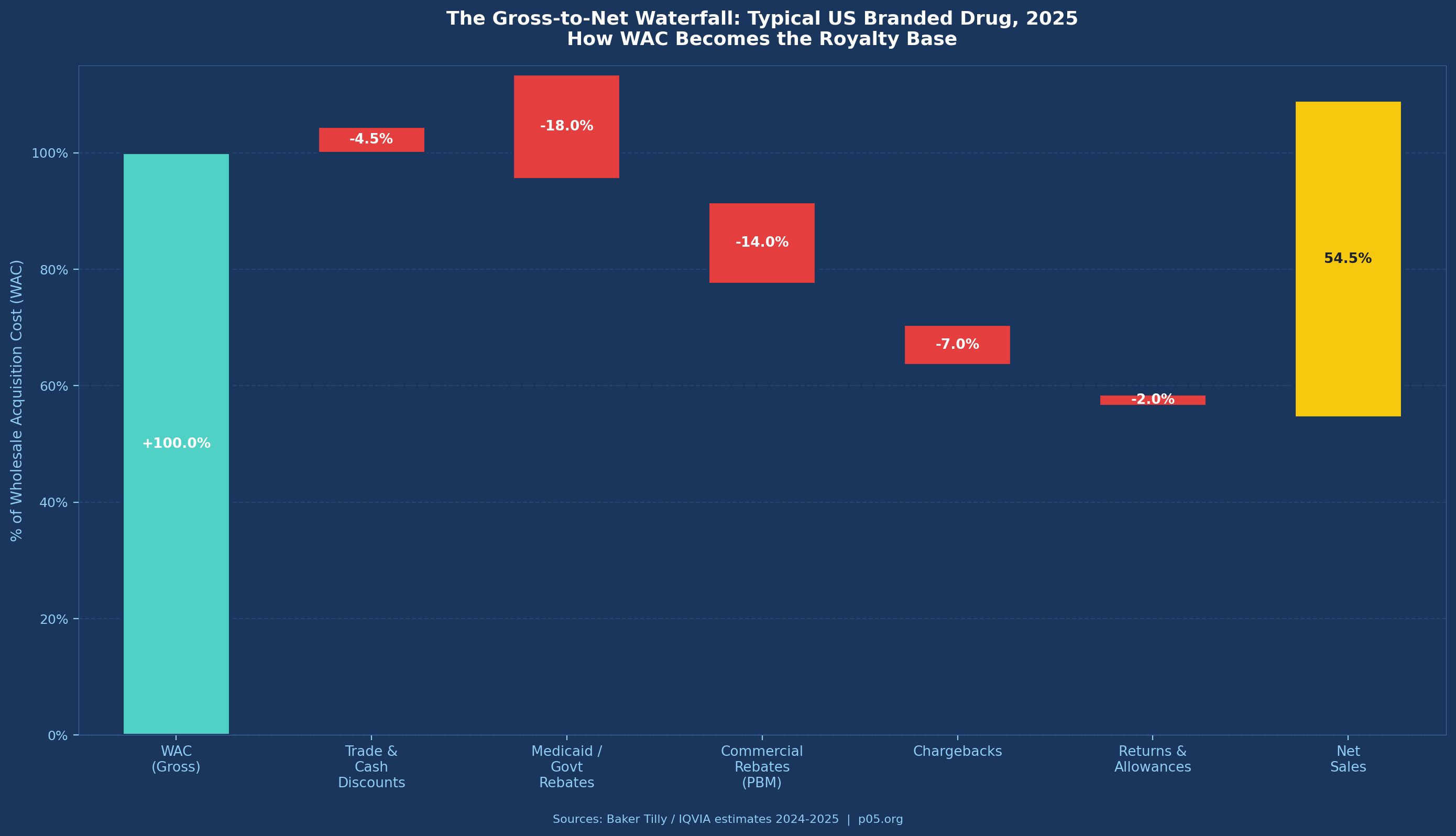 Baker Tilly's 2025 analysis of pharmaceutical GTN functions notes that pricing adjustments "can reduce [WAC] by as much as 70%." While that figure represents an extreme, average GTN discounts for branded drugs in 2024–2025 are estimated at 40–55% of WAC by IQVIA, up from roughly 30–35% a decade ago.