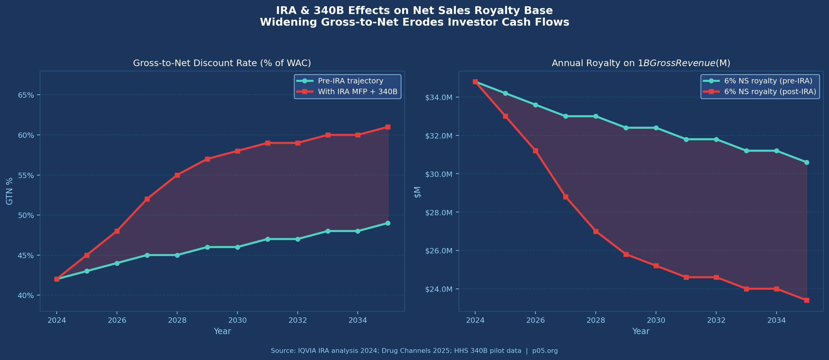 The interaction of MFP with 340B creates potential duplicate discount scenarios that remain legally contested as of March 2026. For royalty investors, the IRA's primary impact is through GTN widening: as manufacturer net prices are compressed, the gap between gross and net sales narrows the royalty base.