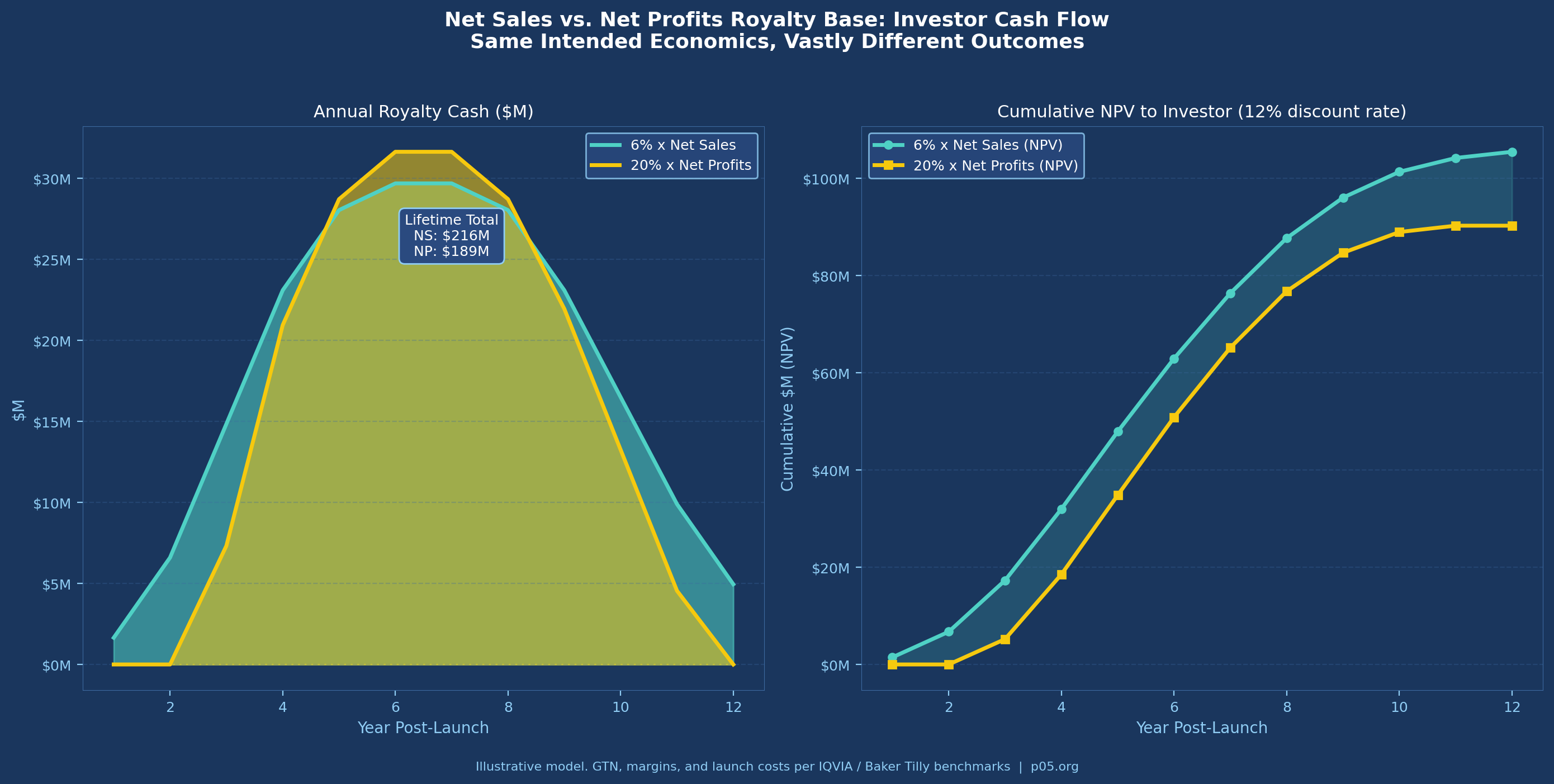 The table understates the comparison in one critical respect: a net profit royalty is worth nothing in any year the product runs at an operating loss. For a newly launched product with substantial commercial investment, the early years of a royalty term — often the most valuable in NPV terms — generate zero return under a profit base. A 6% net sales royalty begins generating cash on day one of commercial sale.