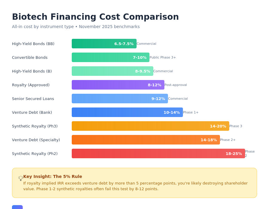 The math is unforgiving. When Royalty Pharma targets mid-teens IRRs on development-stage assets and achieves 15.7% ROIC across their portfolio, companies are paying venture-capital returns for what functions as debt. Meanwhile, venture debt costs 8–15%, senior secured loans run 9–12%, and high-yield bonds price at 6.5–10% for those who can access them.