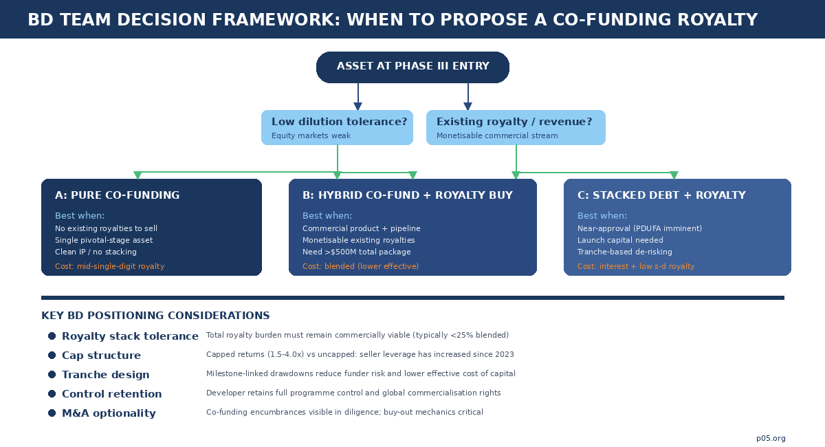 For a biotech BD team approaching a Phase III financing decision, the co-funding royalty demands more than term-sheet negotiation. It is a strategic positioning exercise that requires solving simultaneously for capital needs, dilution constraints, programme control, royalty-stack management, and downstream M&A optionality. The framing determines which counterparties engage and at what terms.