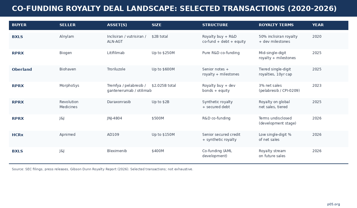 Every major royalty-focused capital provider has developed its own variant of the co-funding structure, tailored to its portfolio construction and return targets. Studying the deals in sequence reveals the mechanics and the competitive dynamics shaping the market as of April 2026.