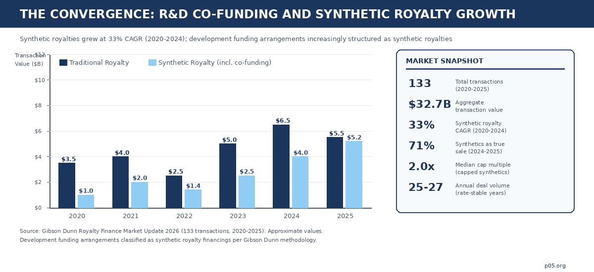 Six years of deal data now exist to study. Gibson Dunn's 2026 Royalty Finance Market Update catalogues 133 transactions totalling $32.7 billion in aggregate value across 2020-2025. Synthetic royalties — the category that captures co-funding arrangements — grew at an average annual rate of 33% over the five-year period. Annual deal volume held steady at 25-27 transactions per year even as the federal funds rate climbed above 5%, and the market reached record levels once rate volatility stabilised. A mature and expanding asset class with $32.7 billion behind it demands a correspondingly serious treatment.