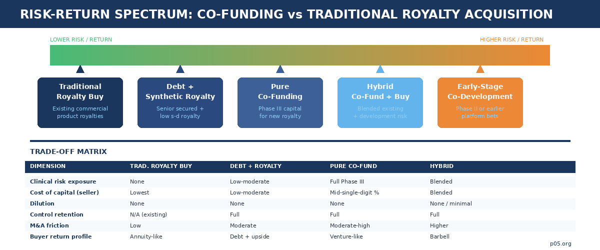 The co-funding royalty, as practitioners now call it, lets the buyer manufacture the royalty stream it will later own. The seller retains full programme control, avoids equity dilution, and sidesteps the covenant architecture of venture debt. The risk profile sits between venture and annuity — clinical-stage uncertainty on the front end, duration-matched cashflow on the back end — and the contractual engineering required to make it work is dense, bespoke, and increasingly competitive.