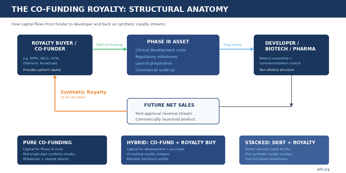 Somewhere between a licence, a loan, and an equity investment — but structurally none of these — sits a transaction type that has quietly become one of the most consequential instruments in late-stage pharmaceutical finance. No IP changes hands. No fixed coupon is owed. No shares are issued, no board seats granted. The capital provider funds Phase III clinical development and, in exchange, receives a newly created synthetic royalty on future product net sales.