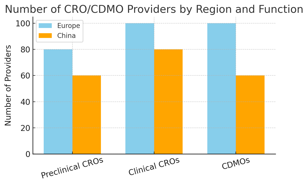 Figure 1: Number of CRO/CDMO providers by region and function (preclinical research CROs, clinical trial CROs, and manufacturing CDMOs). Europe hosts a slightly larger number of contract manufacturers and research organizations, reflecting its mature pharma base, while China’s rapid growth has built a substantial cadre of CROs and CDMOs as well. (Numbers are illustrative estimates.)
