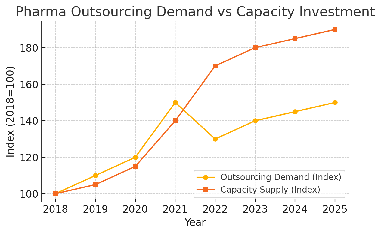 Economics 101 teaches that when supply overshoots demand, a reckoning follows. By 2023, cracks in the CRO/CDMO boom narrative were becoming visible. Demand growth faltered just as a surge of new capacity came online. Figure 2 shows a high-level index of “outsourcing demand” vs. “capacity investment” over the past years. The orange line (capacity) shoots up sharply around 2021–2022, reflecting the building spree – new production suites, hiring sprees, and acquisitions of facilities. The yellow line (demand) tells a different story: after the pandemic peak, demand (proxied by biotech funding and pipeline growth) dipped in 2022 and has only partly recovered.