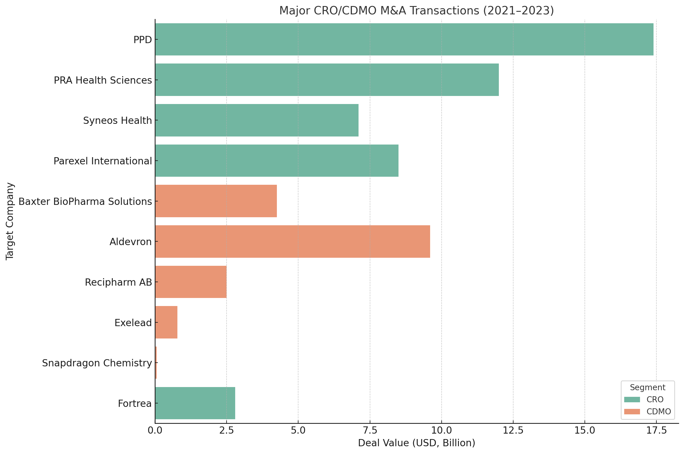 Table 1 highlights selected major M&A transactions in the CRO/CDMO arena since 2021. These deals underscore a few themes: mega-deals among CRO giants, private equity carving out pharma company divisions and taking them private, and targeted acquisitions in specialized niches (often advanced therapy manufacturing).