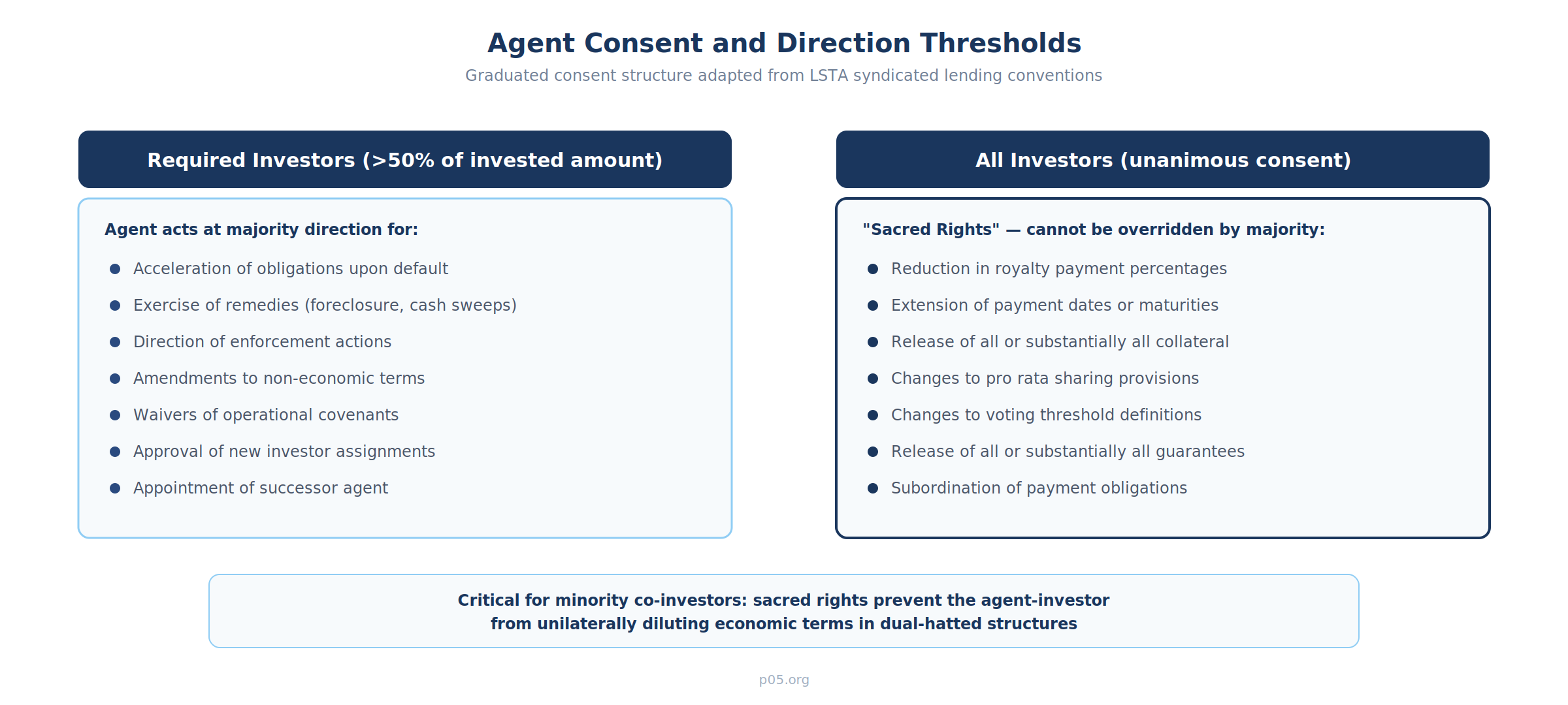 This graduated consent structure directly mirrors syndicated lending conventions. The "sacred rights" requiring unanimous consent protect individual investors from having their economic terms diluted by a majority vote—a particularly important protection in co-investment structures where one fund's affiliate serves as agent.
