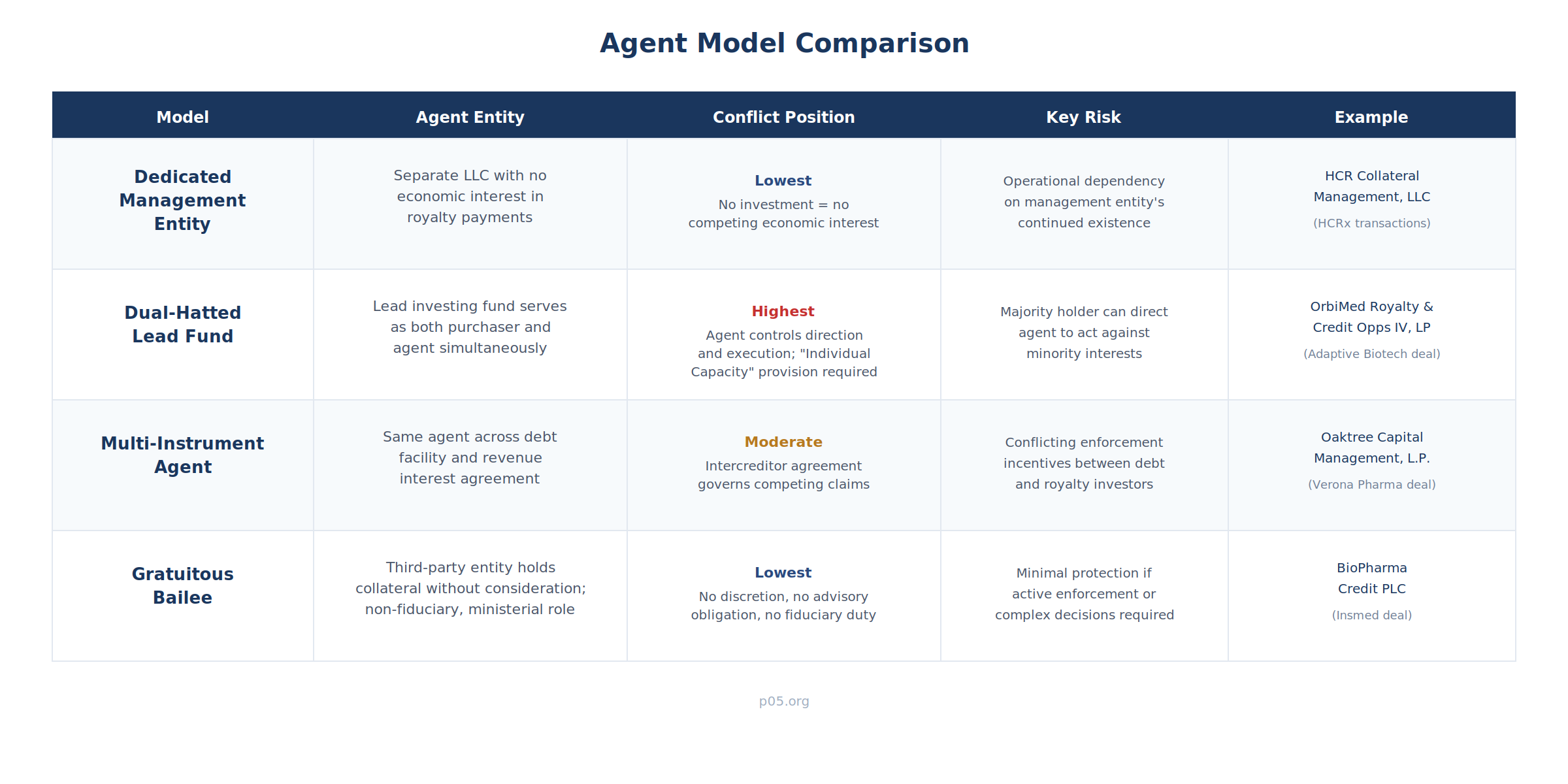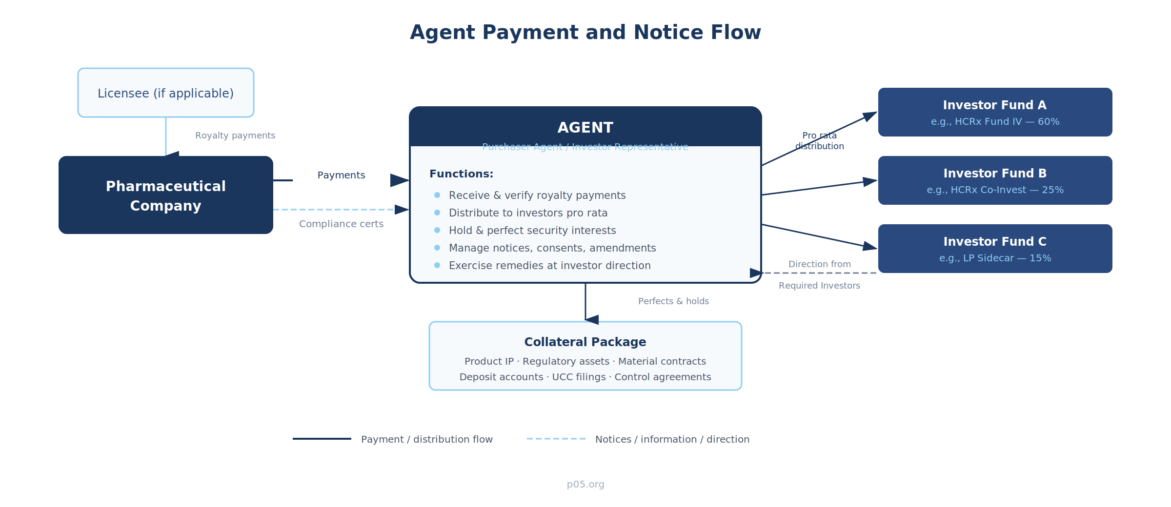 The agent designation determines who receives payments, who holds collateral, who processes amendments, and who pulls the trigger on enforcement. In a bilateral transaction none of this requires a separate role. But the pharmaceutical royalty market has moved well beyond bilateral structures—and the agent question now carries consequences that flow through to economics, operational flexibility, and downside protection.