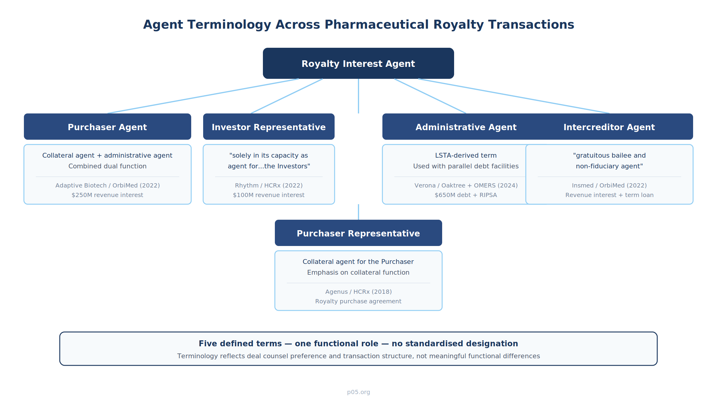 The royalty interest agent—whatever its defined term in any given transaction—is the operational nexus of the pharmaceutical royalty financing relationship. The five distinct designations identified in recent filings (Purchaser Agent, Investor Representative, Purchaser Representative, Administrative Agent, Intercreditor Agent) reflect deal counsel preferences and structural nuances rather than meaningful functional differences. But the contractual architecture behind each designation—the exculpation standards, fiduciary disclaimers, consent thresholds, collateral mechanics, and individual capacity provisions—varies in ways that carry real consequences for both companies and investors.