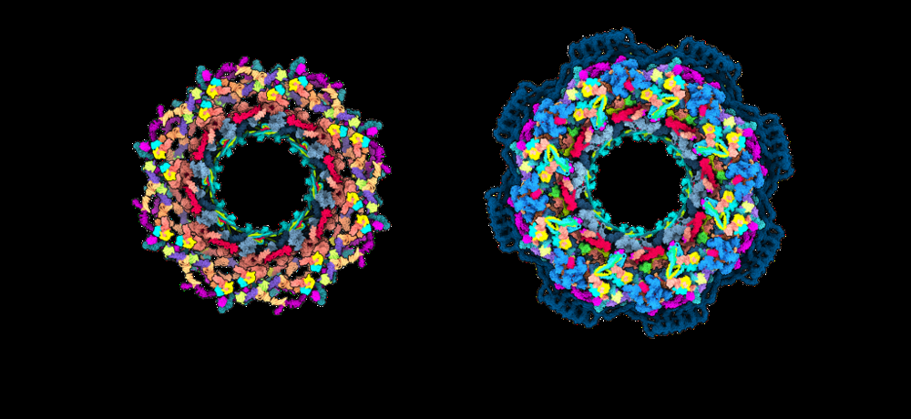 Combining AI predictions with cryo-electron microscopy allowed researchers to solve the massive nuclear pore complex. The image shows the human nuclear pore core structure before (left) and after (right) integrating AlphaFold2 models, going from ~46% to >90% complete (embl.orgembl.org). Such AI-augmented assemblies reveal how proteins come together in cells, aiding drug discovery for complex targets.