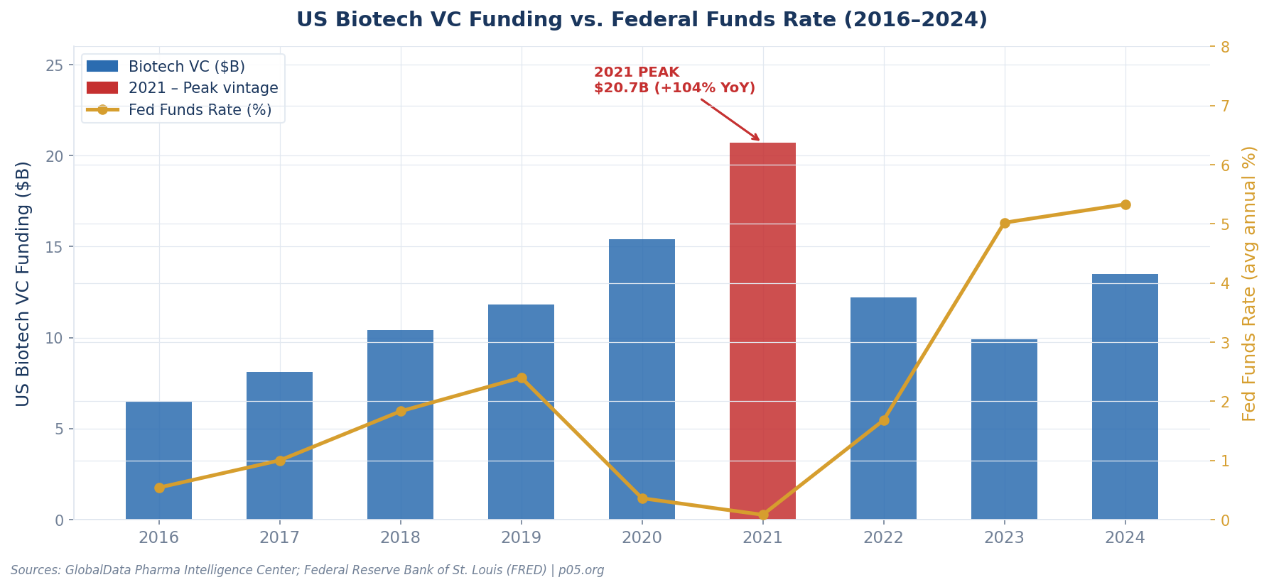 In 2021, venture financing for US-headquartered companies with innovator drugs peaked at approximately $20.7 billion, a 104% increase from the prior year. This was not a gradual build — it was a step-change driven by a collision of factors unlikely to repeat in combination: