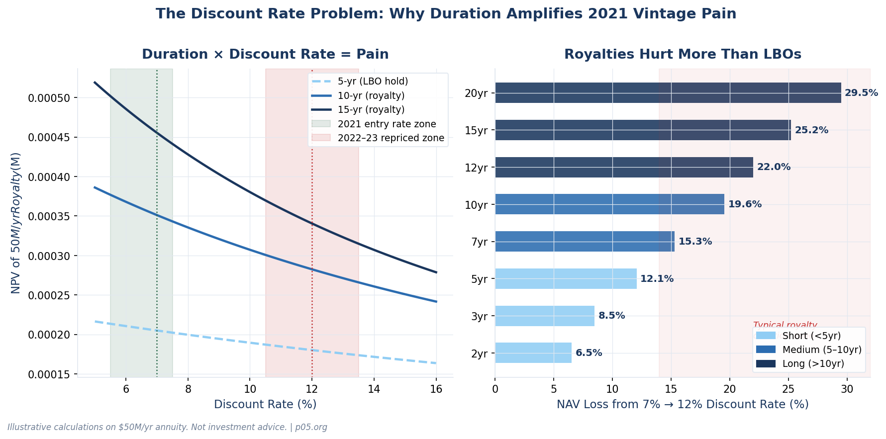 The most mechanical problem: deals priced at 6–7% are now worth less because the market requires 10–12% returns on similar risk profiles. A 12-year royalty repriced from 7% to 12% loses approximately 20% of its original NPV — purely from the rate change, before any drug-specific underperformance.
